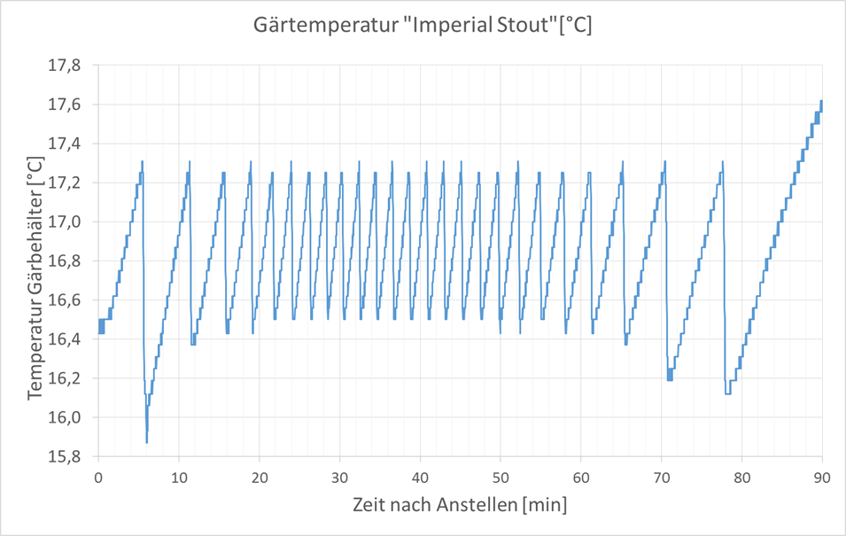 2) Im mittleren Bereich des Graphen, also zwischen etwa 1200-2800 min nach Anstellen scheint die Konvektion durch Gärung so gut zu sein, dass eine relativ homogene Durchmischung der Würze erfolgt. Die Minimalwerte nach Beendigung des aktuellen Kühlzyklus liegen ziemlich genau auf einer Linie bei 16.5 °C.