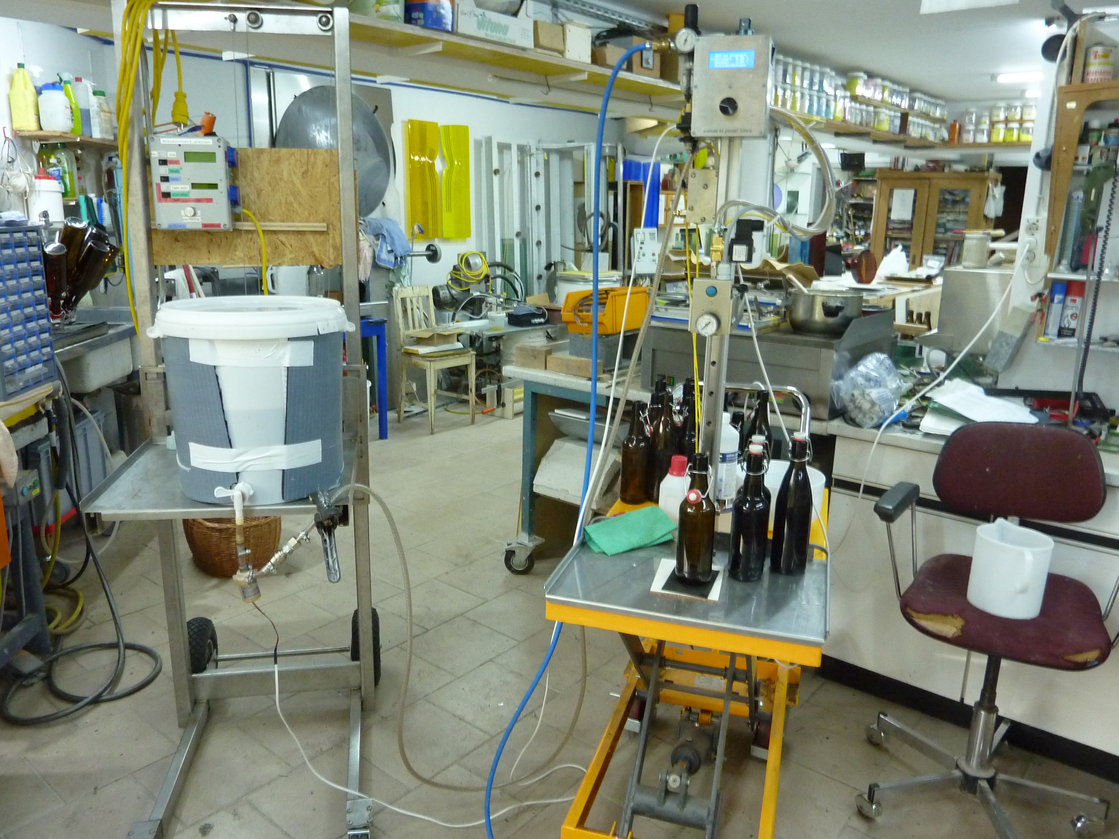 und wieder ist in meiner kleinen Brauerei ein Traum in Erfüllung geganngen - den Großen der Branche nachzueifern - der Bohrmaschinenständer hat ausgedient, die überdimensionierten zwei- drei Literflaschen haben ausgedient. Wir füllen heute auf 0,5l Bügelverschlussflaschen (wenn nötig auch auf 0,33l Bügelflaschen) und brauchen für einen Hektoliter dafür nur noch eine knappe Stunde. 1 Stunde Füllen für runde 160 Flaschen - was für ein Tempo.