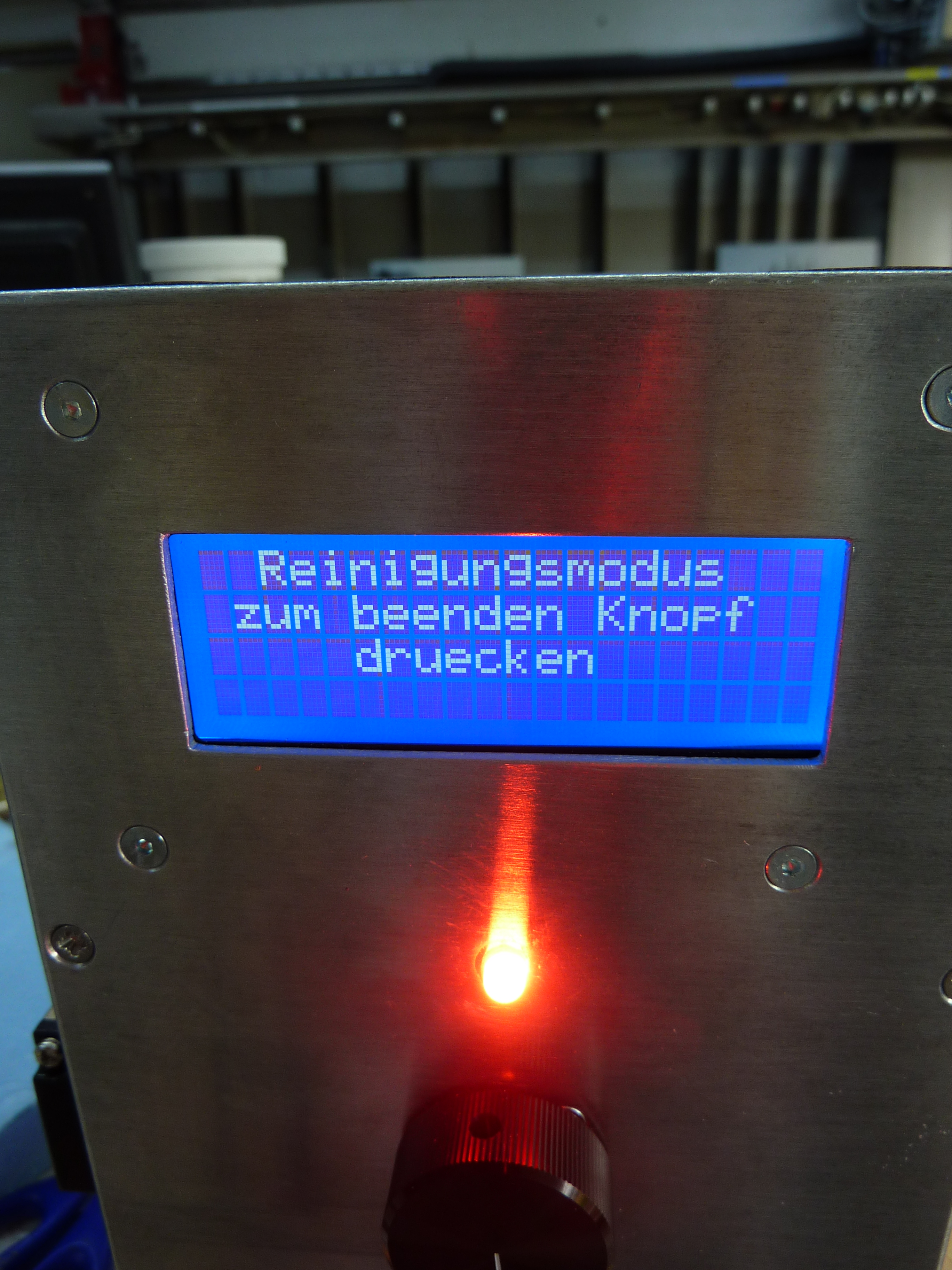 Wählt man diesen an, schalten alle Ventile gleichzeit auf "auf" und Reinigungsmittel oder nur einfaches Wasser aus einem Fass können durch alle Zapfstationen fließen. Der Plattenteller ist so gebaut, dass er jeweils einen 5 Liter Messbecher fassen kann. Also Reinigung ohne Sauerei.