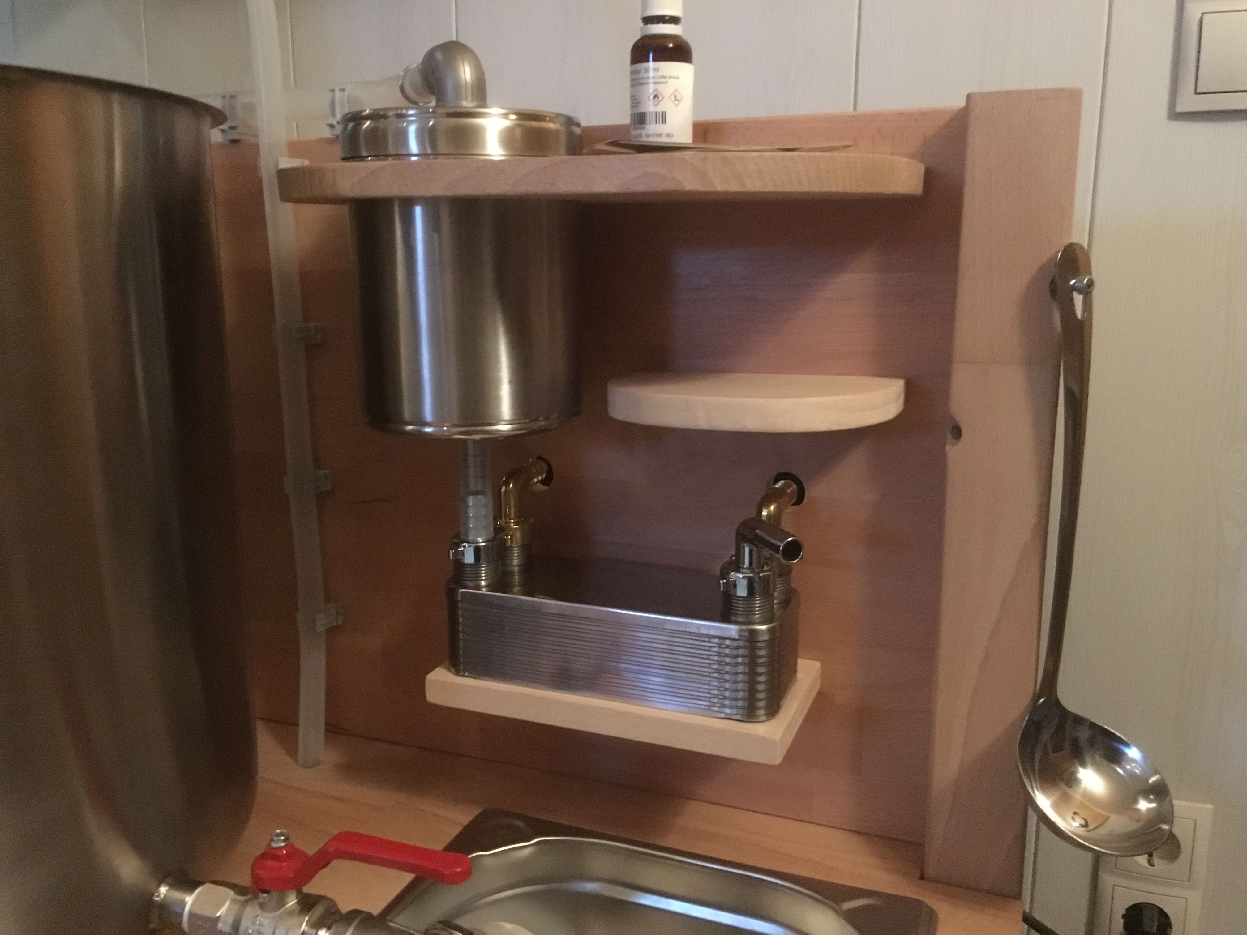 erstmal mein Kompliment für die Anlage. Das sieht alles nach hervorragender Verarbeitung aus. Hast du bei dem Einbauort für die Elektronik bedacht, dass mal etwas daneben gehen/überkochen könnte? Kann das dann irgendwo hinein laufen?