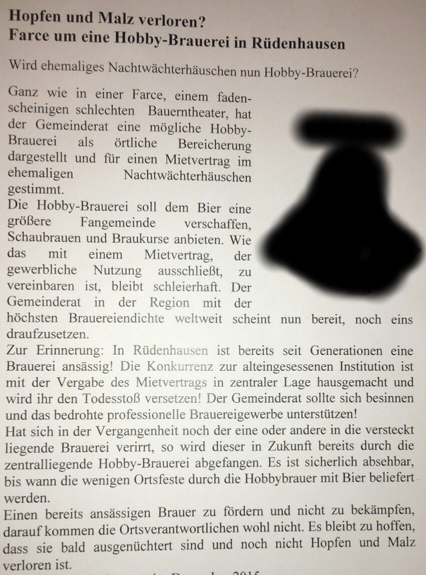 Des weiteren wäre abzuklären, warum denn die örtliche Brauerei keine Kurse und Schaubrauen anbietet. Hätte sie ja können. Hat sie aber nicht. Warum also die Beschwerden? Vielleicht kann man sogar mit ihr zusammenarbeiten. Wenns denen wirtschaftlich so schlecht geht, dass die sich sogar vor einem nicht-kommerziellen Brauer fürchten, hätte ihnen vielleicht schon selber mal die Idee kommen können dass sie etwas ändern müssen wenn sie auf dem Markt bestehen wollen. Also mal anklopfen, Bier mitbringen und fragen wie man sich gegenseitig helfen kann - bevor die Fronten verhärten. Am besten jetzt sofort anrufen oder vorbei fahren, bevor sich das Dorf auf eine Seite schlägt.