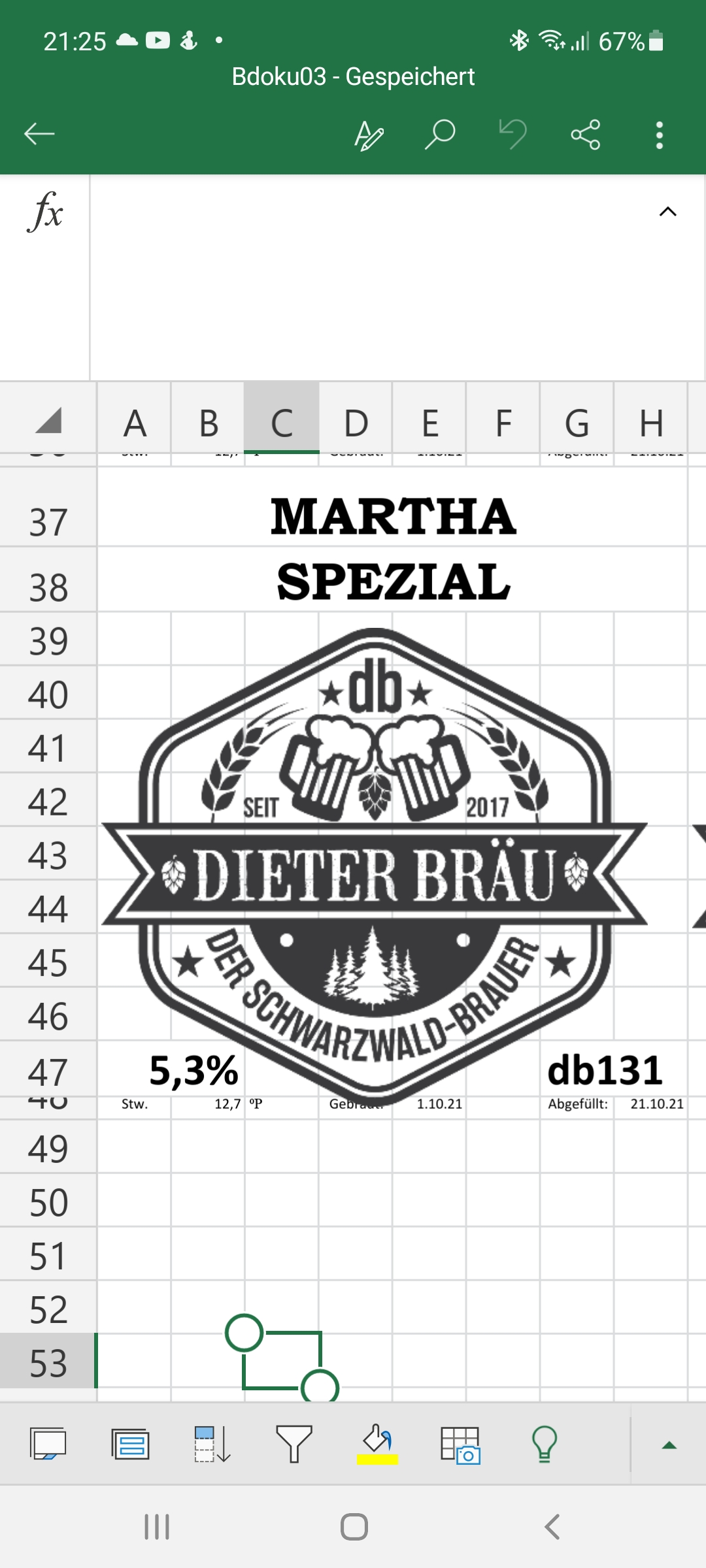 Meine Tochter (arbeitet im Marketing) hat mir dieses schöne Logo gemacht. Das passt gut zu meinen eher traditionellen Brauambitionen. Die veränderbaren Daten auf dem Etikett kommen aus meiner selbsgemachten Excel Datenbank.