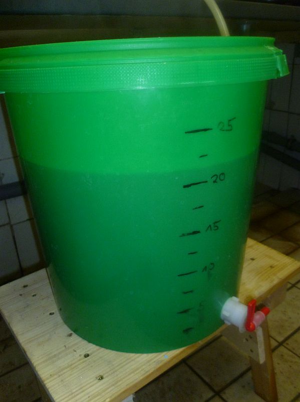 Am Schluss hatte ich knapp 22 Liter in meinem Gärbehälter. Die hab ich über Nacht abkühlen lassen und dann bei 15°C mit reichlich Hefe (Brewferm Lager mit einem Starter angesetzt, da sie schon länger offen bei mir im Kühlschrank liegt) angesetzt und schön Sauerstoff eingerührt.