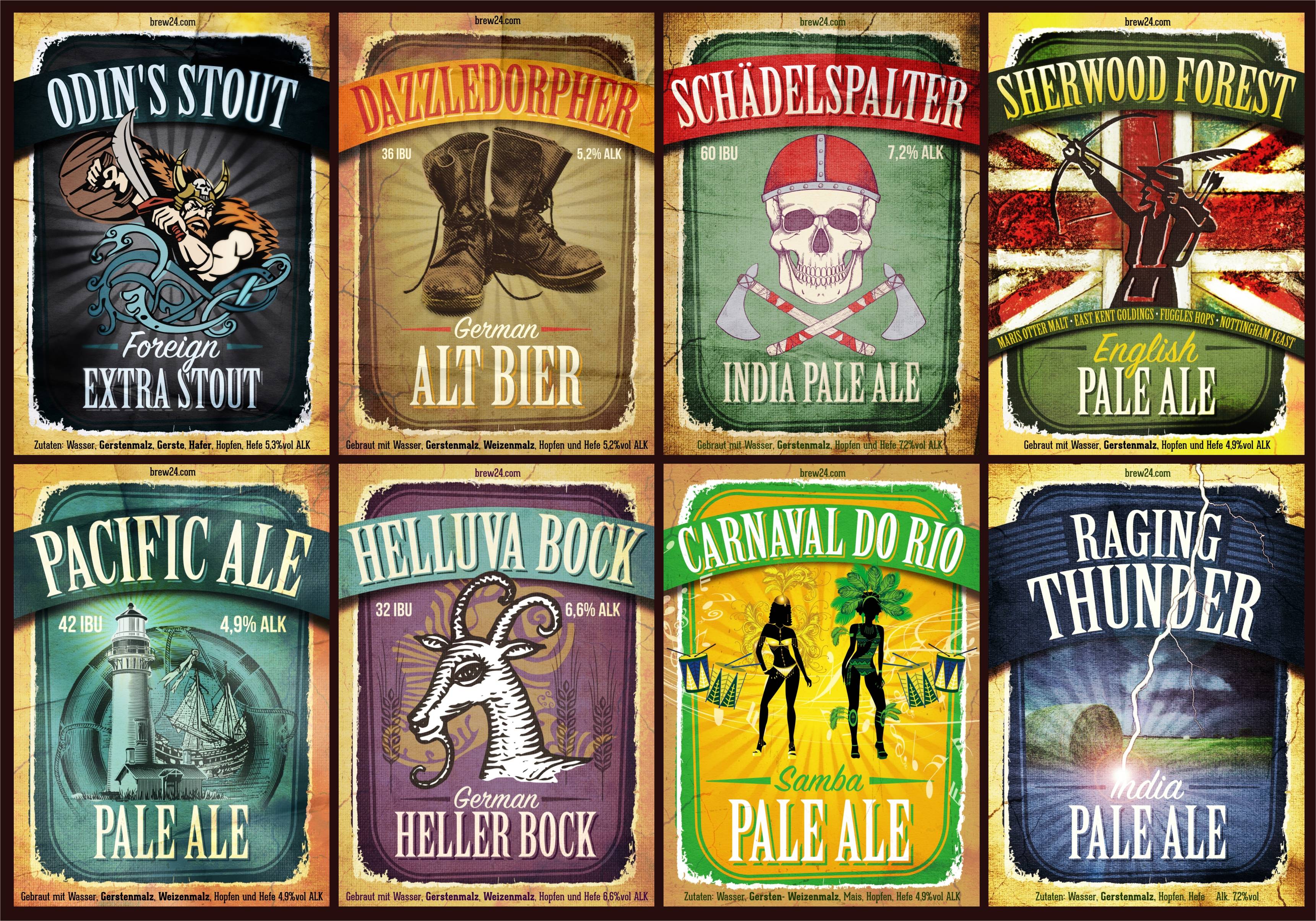 Bei mir werden Etiketten zunächst im Format A4 mit Photoshop erstellt, das ginge auch mit jedem anderen Bildarbeitungsprogramm, z.B. dem kostenlosen Gimp oder paint.net. Danach werden die Etiketten im Format 70x98 mm in ein Hilfsliniengerüst in Corel Draw auf eine A4Seite importiert. Zwischen den Etiketten sind 2mm breite Stege, der Hintergrund ist dunkelbraun. Die fertigen Bögen sehen dann so aus: