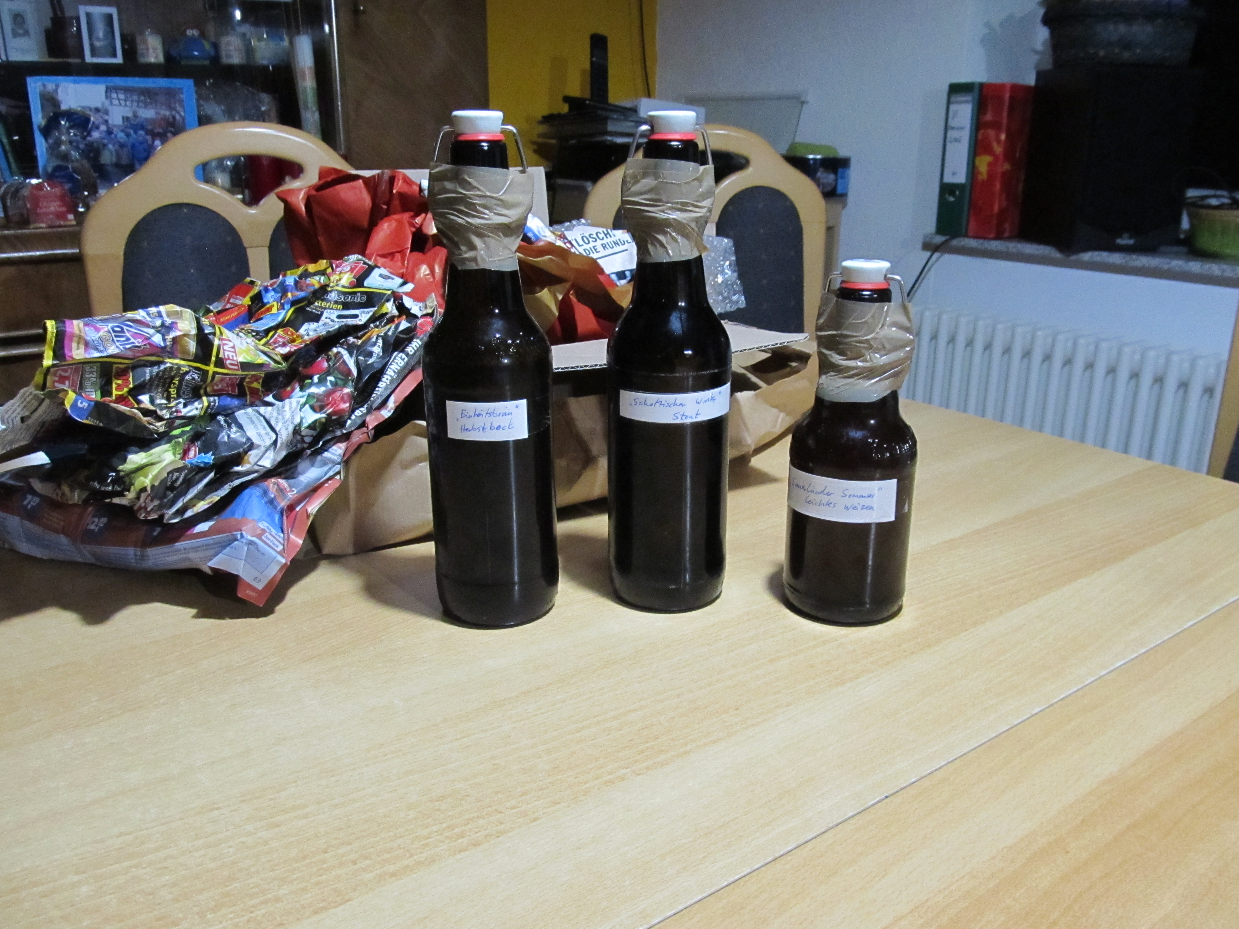 Ich habe meine Wichtelbiere von Klaus (hkpdererste) bekommen. Insgesamt gab es 7 Biere (4 selbst gebraut, 3 Kaufbiere), was mich ein wenig beschämt, da mein Wichtel nur läppische drei 0,3er-Flaschen bekommen hat (sorry, schloemi). "Bewerten" werde ich nur die selbst gebrauten Biere (zu den anderen melde ich mich dann mal per PN bei Dir, Klaus).