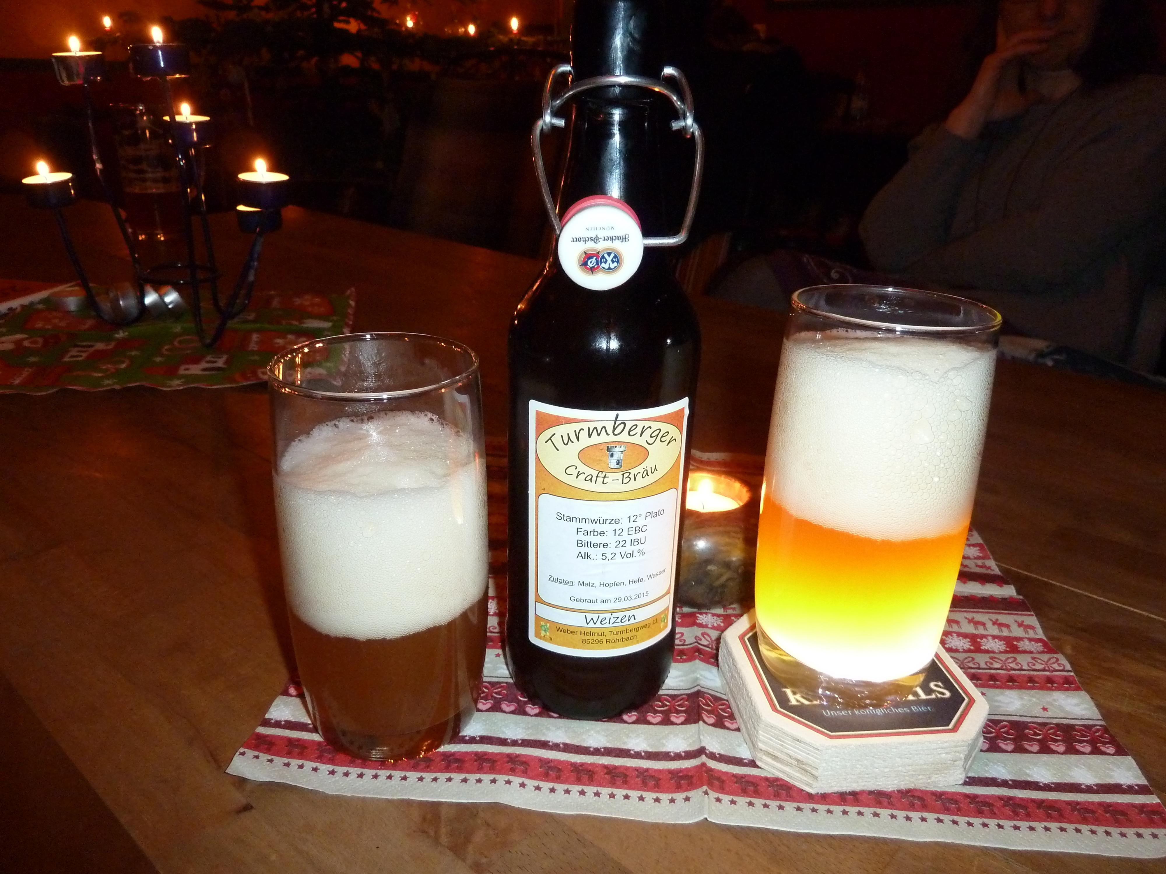 Der Geschmack ist frisch und wenn man das Getränk nicht sähe, würde man ein helles Bier vermuten. So aber ist es blickdicht schwarz, daher wäre eine eventuelle Trübe nicht aufgefallen (an der ich mich ebenfalls nicht störe). Wie Weizen schmeckt und riecht es nicht, es ist schlicht ein gutes solides Bier mit nicht zuviel Malzgeschmack, einem super Hopfen und einer jahreszeitlich passenden Farbe. Ebenfalls gut gemacht, ich bin gespannt aufs nächste Wichtelbier.