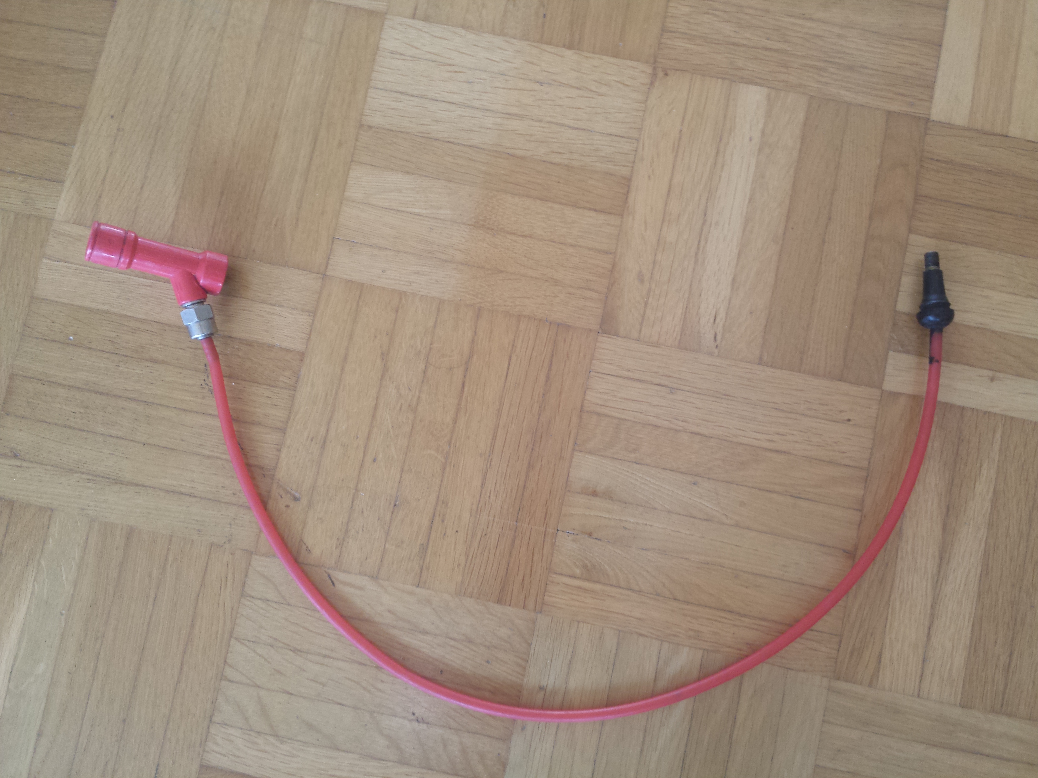 Am Autoventil entfernte ich das Innenventil und klebte mit einem guten Kleber den Schlauch hinein. Diese Ventile hat jeder Reifenhändler parat denn sie kommen an die Felgen der Autos.