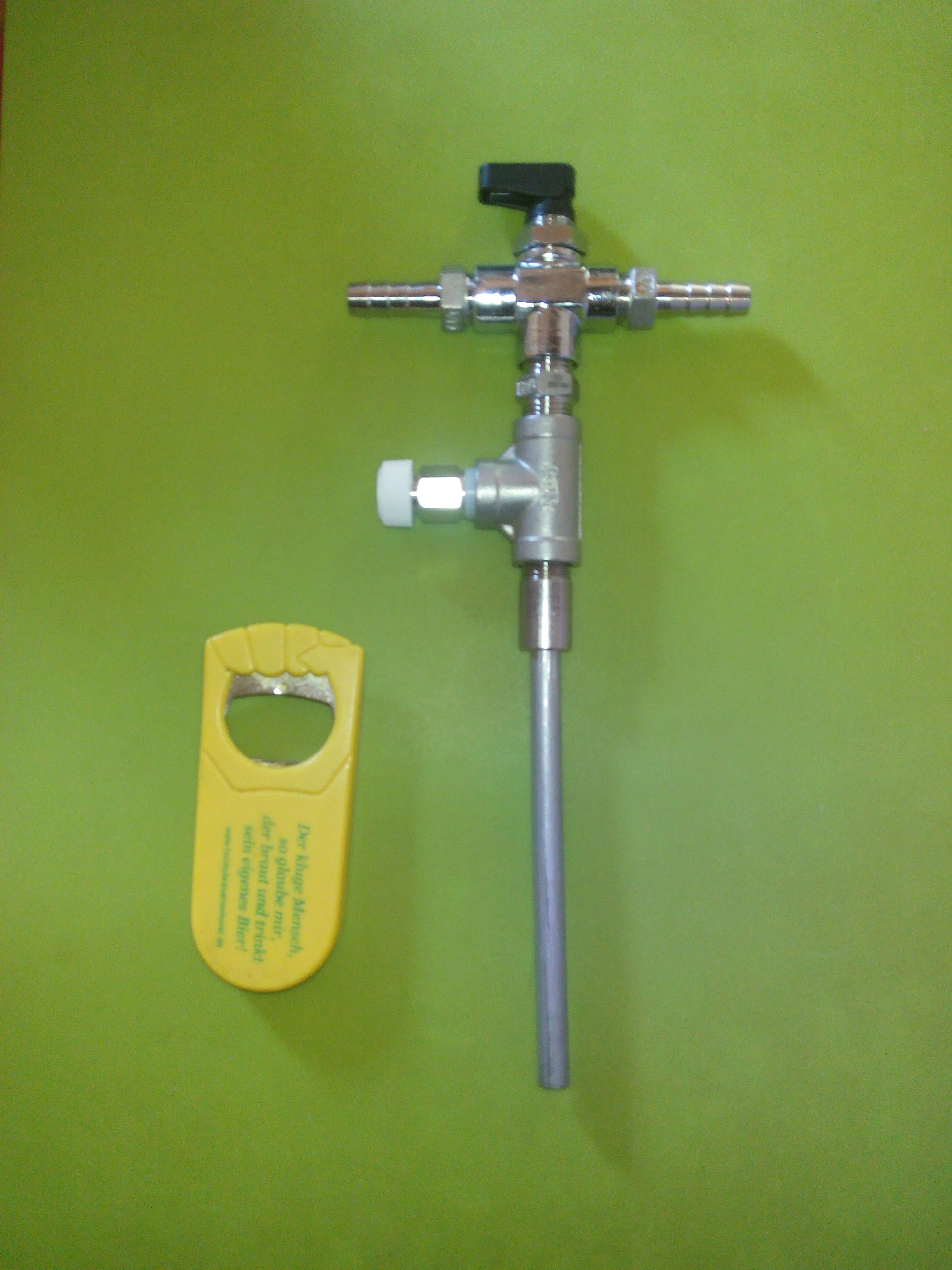 => mit der einen Hand vorsichtig Bier auf, mit der anderen die Flasche und den Schlauch halten ( bei zu viel Druck oder zu großen Loch, oder zu großem Durchmesser des Schlauches, könnte der Schlauch raushüpfen. (Ich habe so aus ZKT's bis zu 2,5bar Proben genommen.)