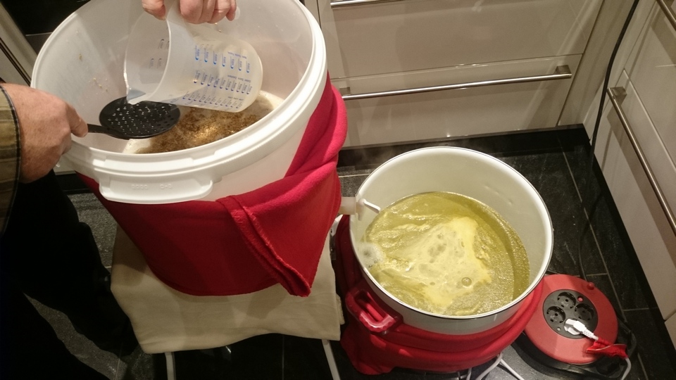 Nach Kochende hatten wir 17P gemessen, die wir dann mit kaltem Wasser auf 13,5P vermengt haben.