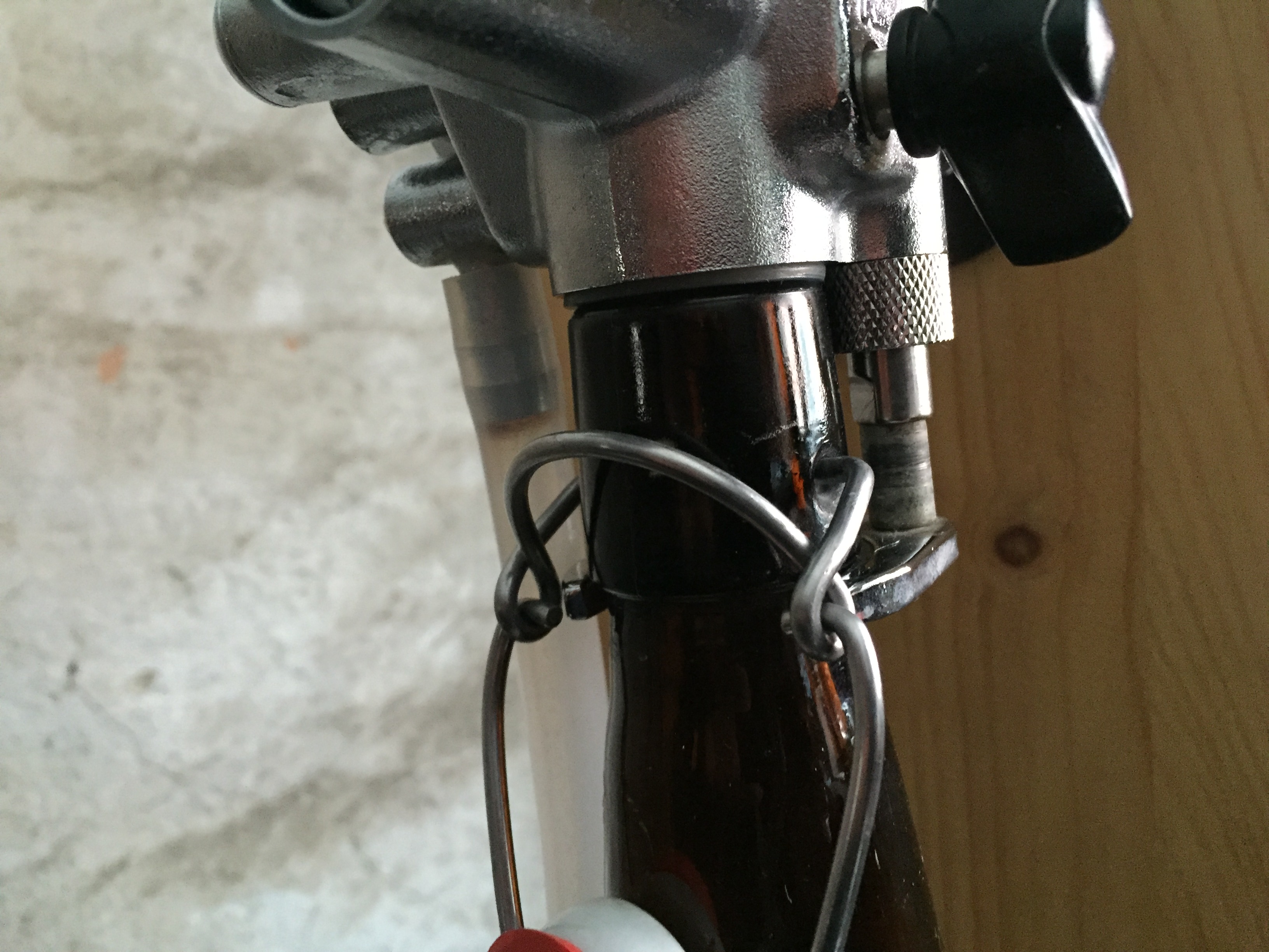 passend gefeilter Flaschenhalshalter für Bügelverschlussflaschen,  (die Schrauben sind noch aus der Testphase und sollten dringend durch Edelstahl ersetzt werden...)