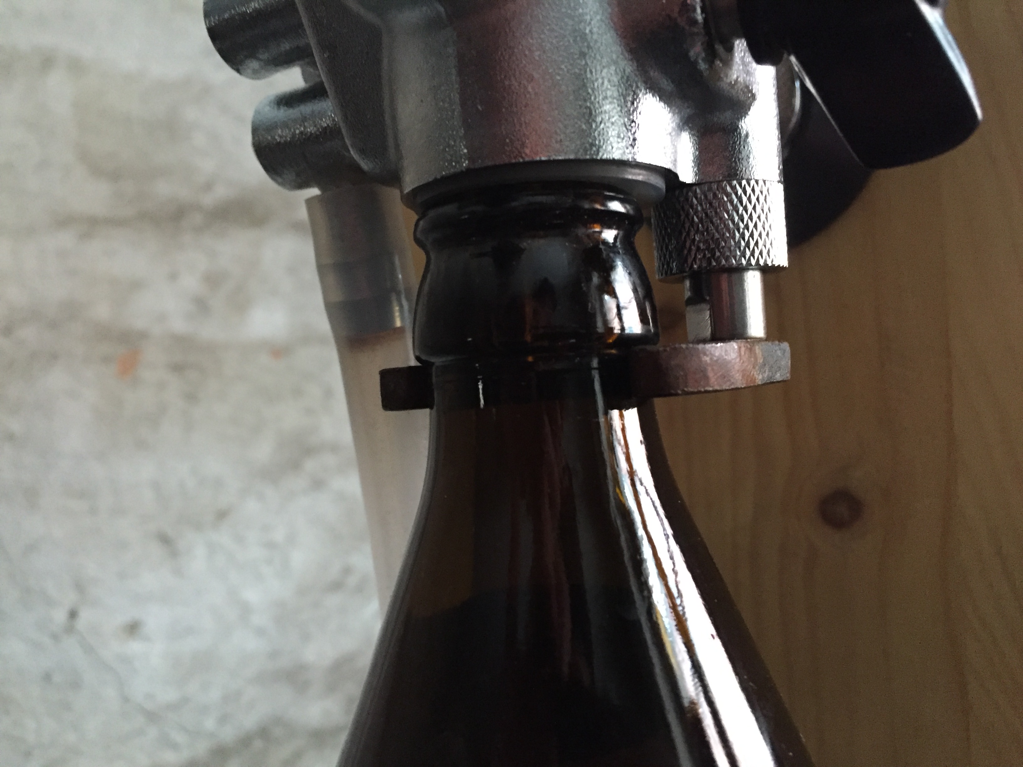 passend gefeilter Flaschenhalshalter für Bügelverschlussflaschen,  (die Schrauben sind noch aus der Testphase und sollten dringend durch Edelstahl ersetzt werden...)