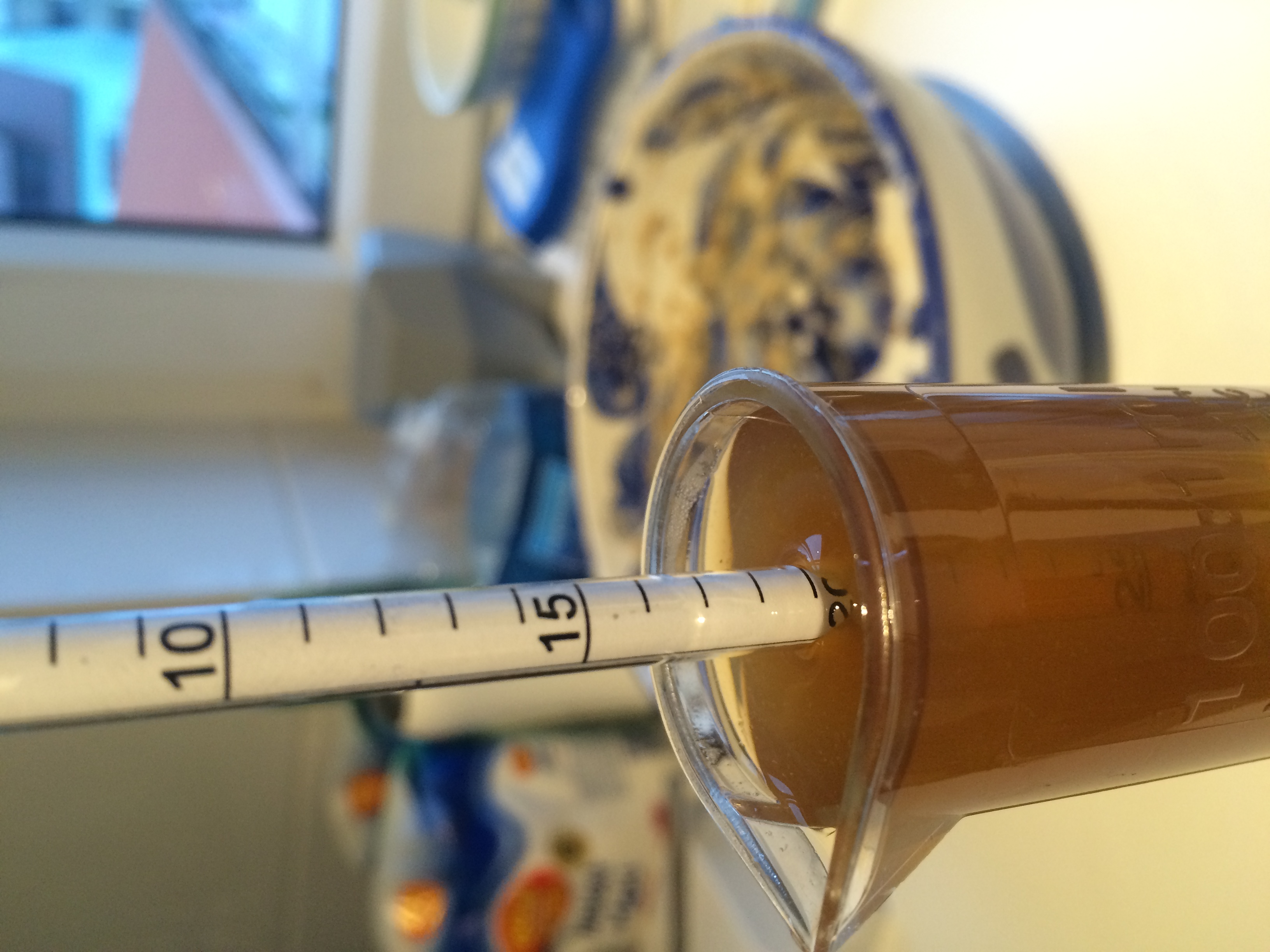 Leider hat es nicht so ganz mit der gewünschten Würzemenge ~10L geklappt. Nachdem ich beim Läutern und den Nachgüssen zu Viel Würze für den 10L Topf hatte und einen Teil davon weggepackt habe waren es nach dem Hopfenseihen noch knapp 5,5 Liter - dafür aber auch gnadenlos an der angepeilten Stammwürze vorbei - Statt 13P waren es dann 20,1P :Shocked ! Ich habe dann entsprechend der Formel zur Anpassung nochmal 1,5L abgekochtes Wasser zum Verdünnen in den Gäreimer gegeben und sollte nun passen. Die Hopfenmenge ist nun vermutlich auch etwas zu viel für das Rezept, aber was ist schon Perfekt bei den ersten Suden!