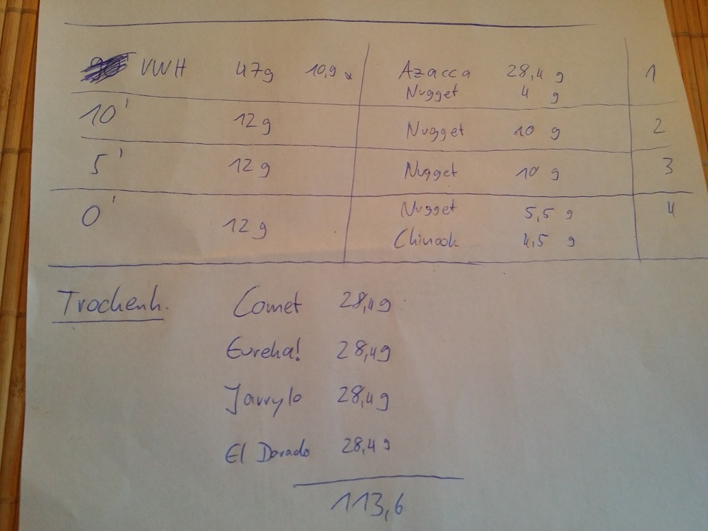 Ich hatte von der BrauBeviale 2015 Nürnberg jede Menge USA-Hopfen übrig. Aus dieser riesen Auswahl suchte ich die Hopfensorten aus und berechnete das Mischungsverhlätnis. Das rezept dürfte somit in dieser Art einzigartig sein.