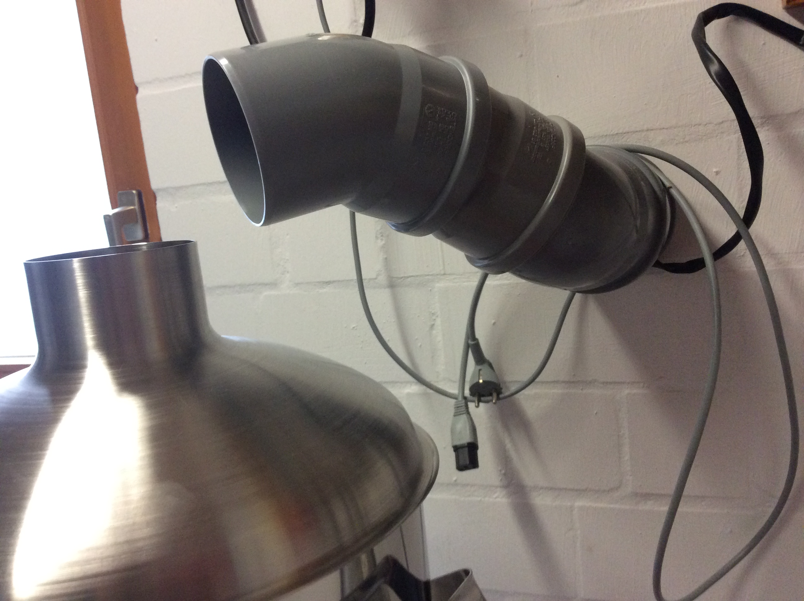 Das Rohr habe ich S-förmig gebogen, durch die Holzplatte geht es noch ein bisschen runter dann wieder leicht gebogen noch oben, Kondens sammelt sich im unteren gebogenen Teil hinter der Holzplatte. Funktioniert gut. Versuche es nächstes Mal mit 5-10 cm über dem Topfrand wieviel Kondens sich bildet und gut abgezogen wird. Lüfter hab ich nicht, Frischluft kommt durch den Kellerschacht.