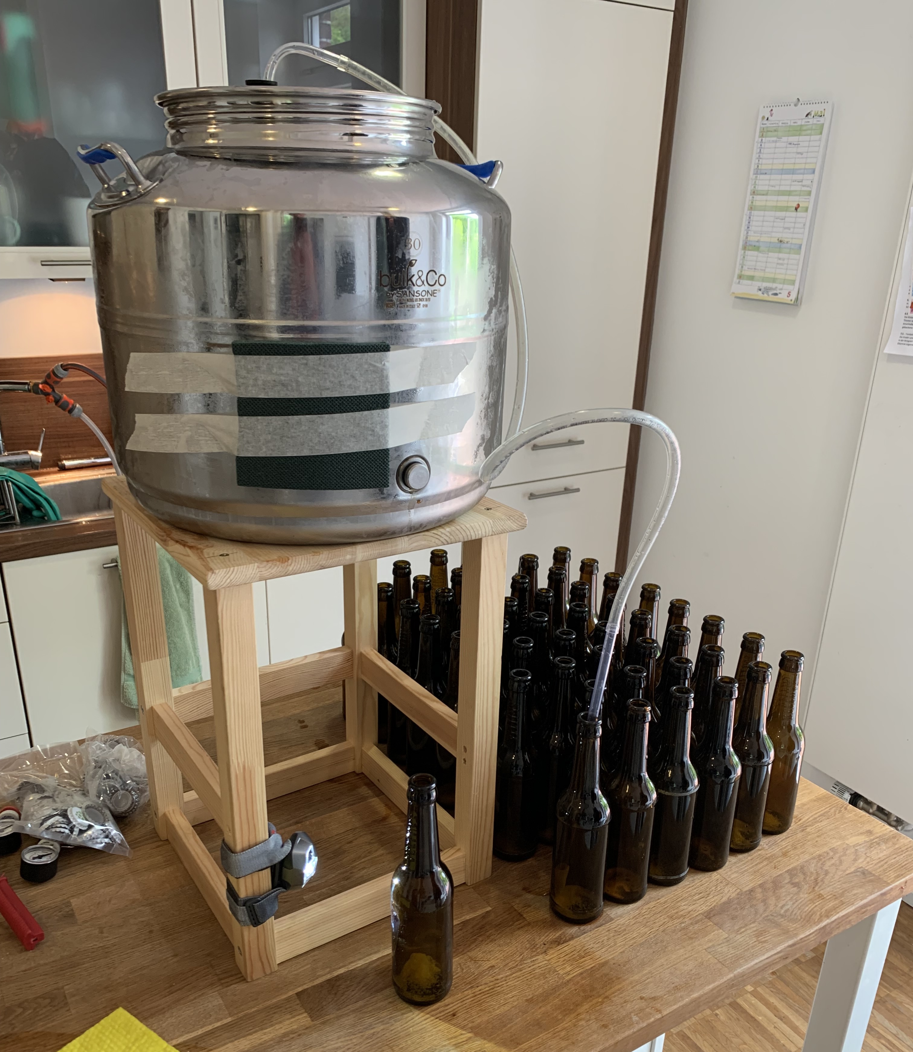 hab den Bottich beim Abfüllen auf einem Holzhocker stehen, der seinerseits auf dem Tisch steht. Der vertikale Abstand zwischen Flaschenhals und Bottichboden beträgt dabei etwa 30cm. Auch der letzte Liter läuft in dieser Konfiguration problemlos in die Flasche.