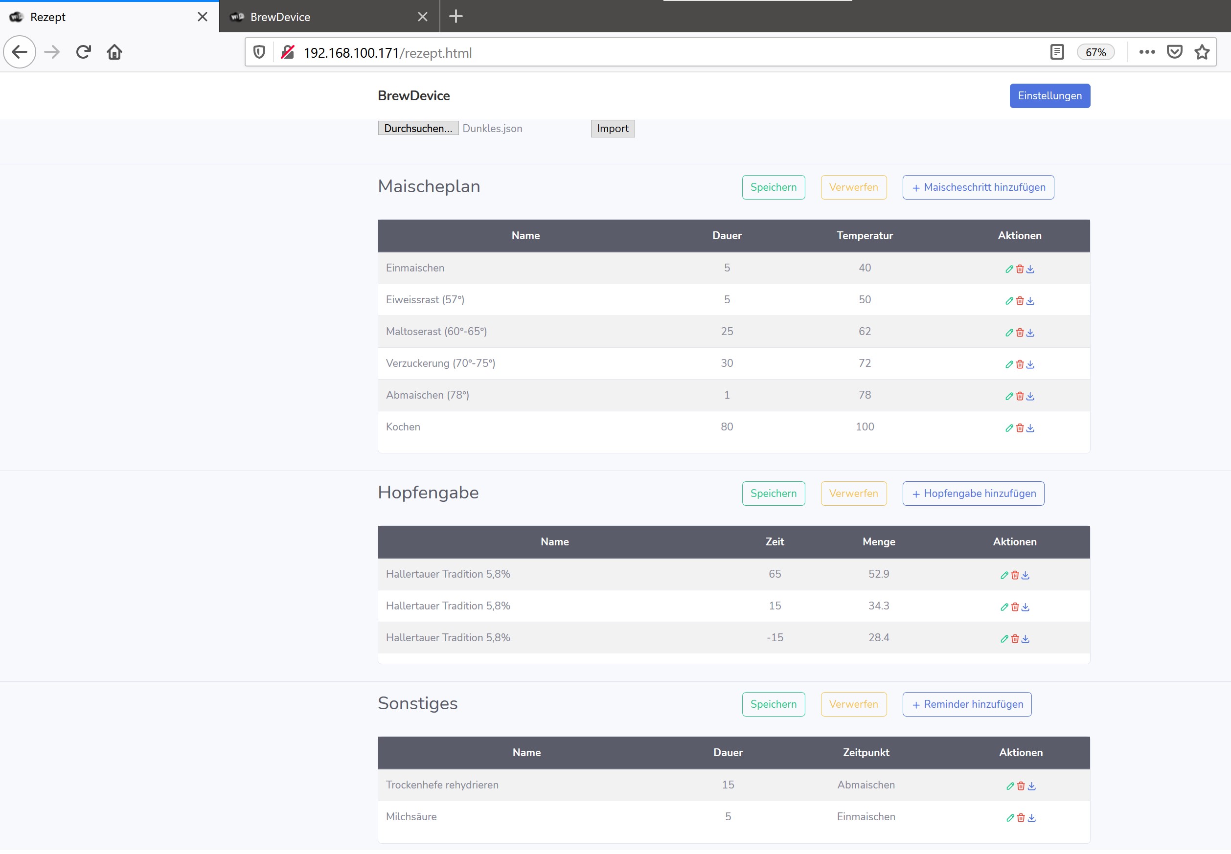 Bei der Brausteuerung habe ich den Fokus bislang auf den optischen Teil der Steuerung gelegt. Bspw. von verschiedenen Geräten identische Anzeigen. Wenn das Rührwerk läuft, muss am PC und am Tablet der Button grün sein. Die ersten Versuche im letzten Jahr brachten den ESP8266 schon ordentlich ans Arbeiten. Hierzu habe ich eine performante Lösung gefunden. Auch der Import aus dem KBH2 war mir wichtig. Der ESP hat aus dem Import KBH2 einen Maischeplan im Speicher, die nun "nur noch" mit einem Timer Objekt abgearbeitet werden muss. An dem Punkt finde ich aktuell jeden Tag noch Ideen oder Verbesserungen, weswegen die Tests Wasserkochen noch warten müssen.