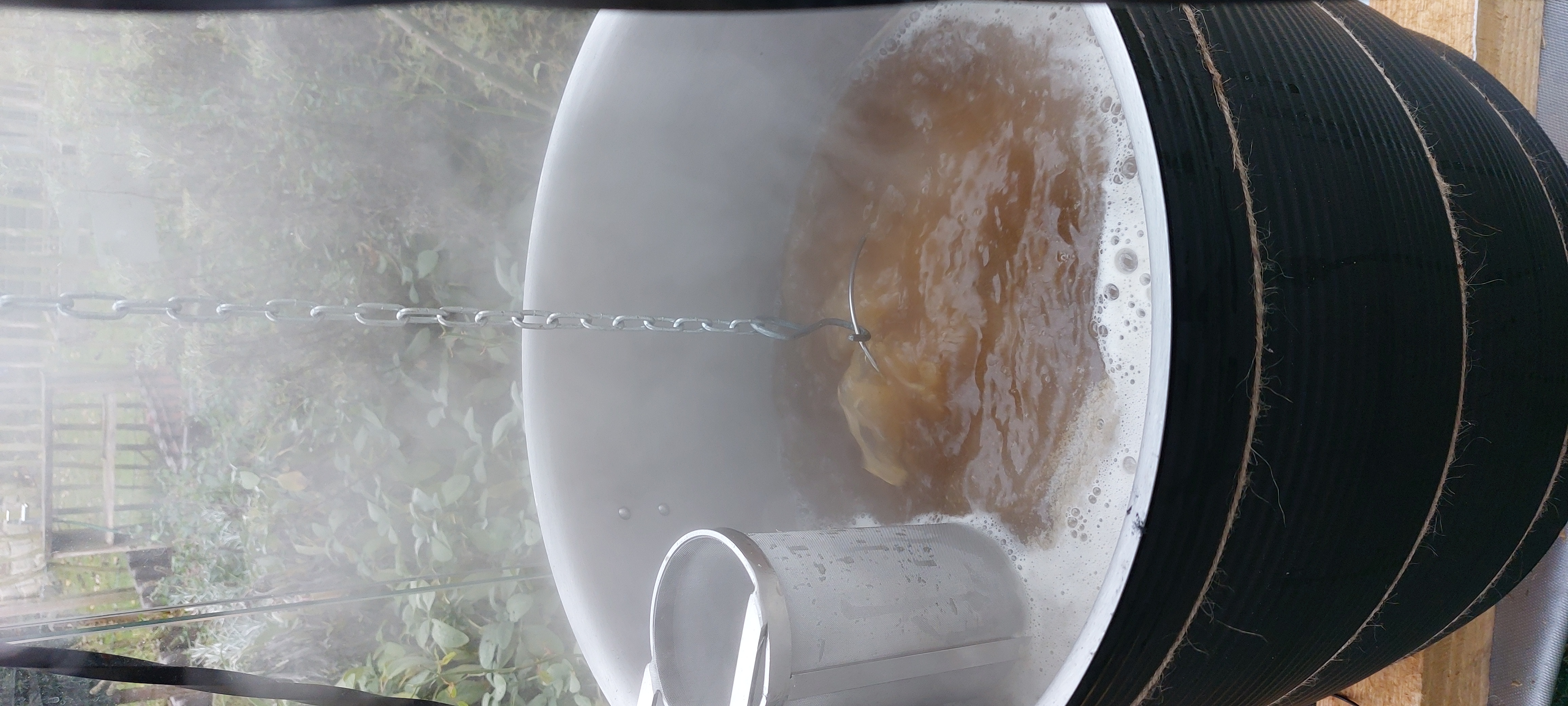 Was die Schüttung und die Hopfengaben angeht bin ich wenig klassisch unterwegs. Ich habe 100% Pale Ale Malz verwendet, sodass ich nach dem Kochen auf 12°P gekommen bin. Hopfen habe ich Comet genommen. Eine Bittergabe als Vorderwürze und eine Aromagabe für 10 Minuten mit gekocht. Dazu muss ich noch sagen, dass es ein Vorderwürzebier ist. Als Hefe ist gerade die US-05 am Werk. Bei dem ganzen ging es mir in erster Linie um den Prozess. Ich kann mir gut vorstellen, ein weiteres Mal so zu brauen. An Holz ist bei mir 1,5 Schubkarren Kirschholz durchgegangen.