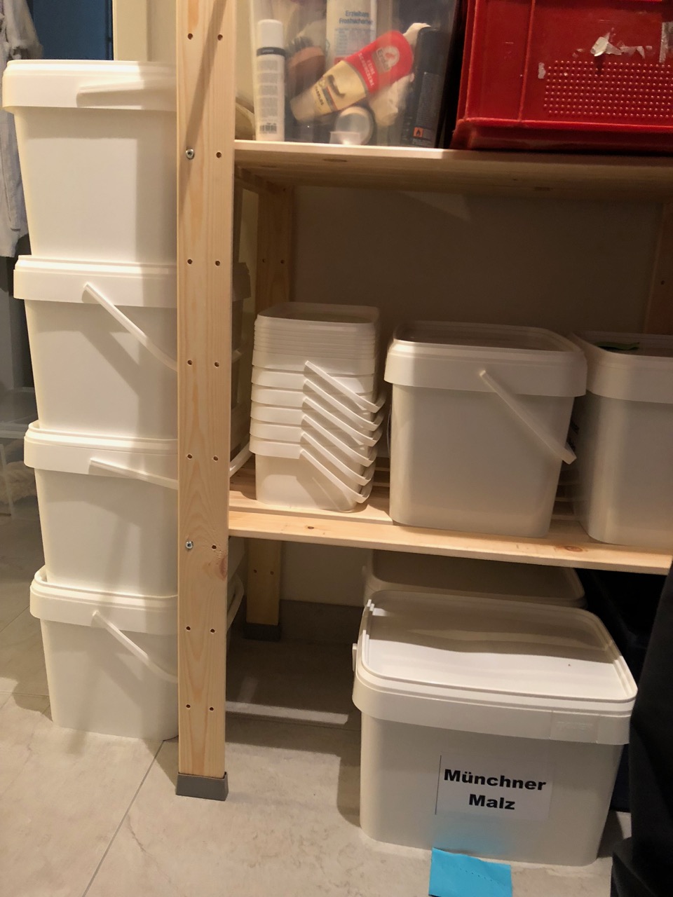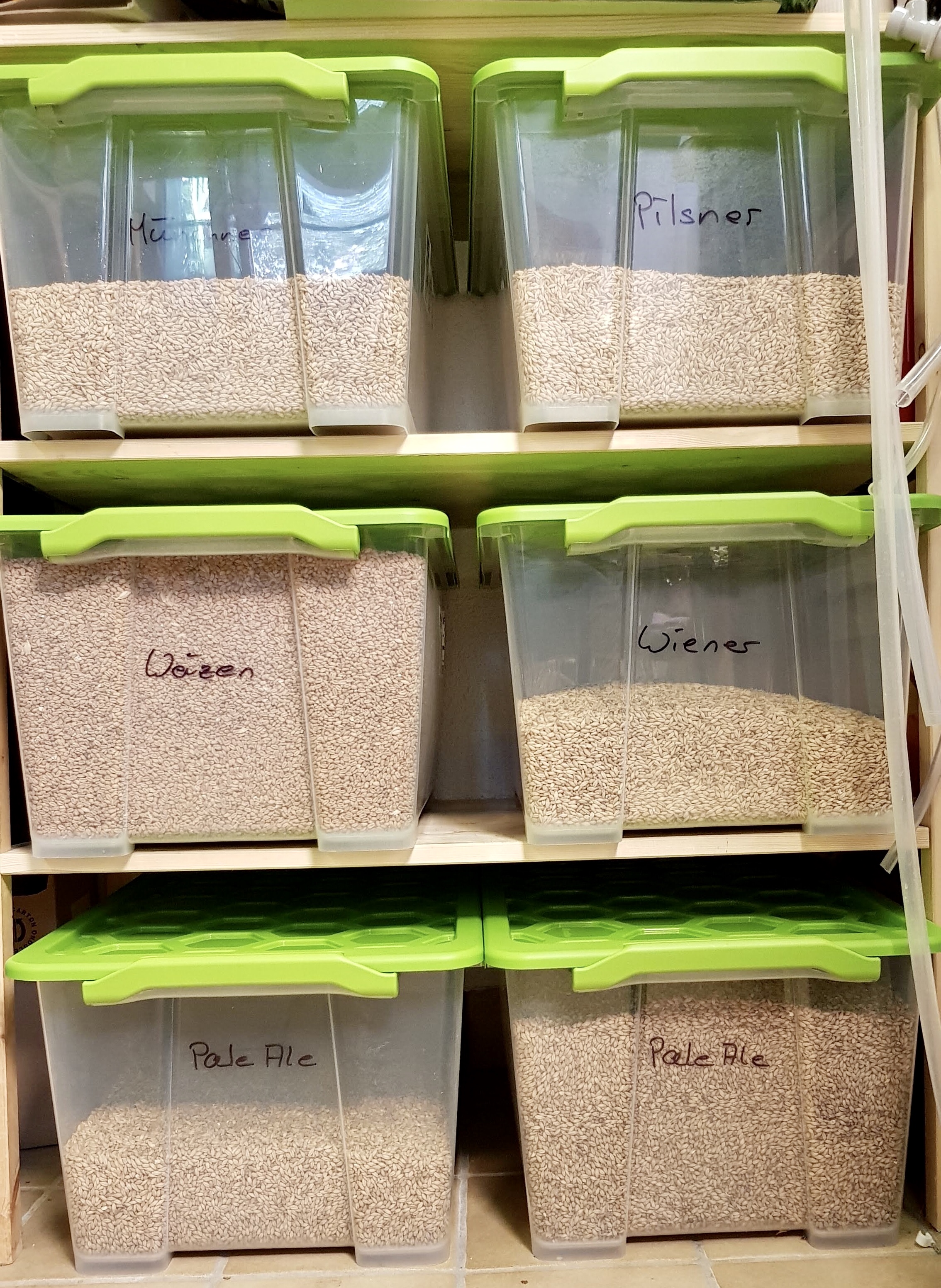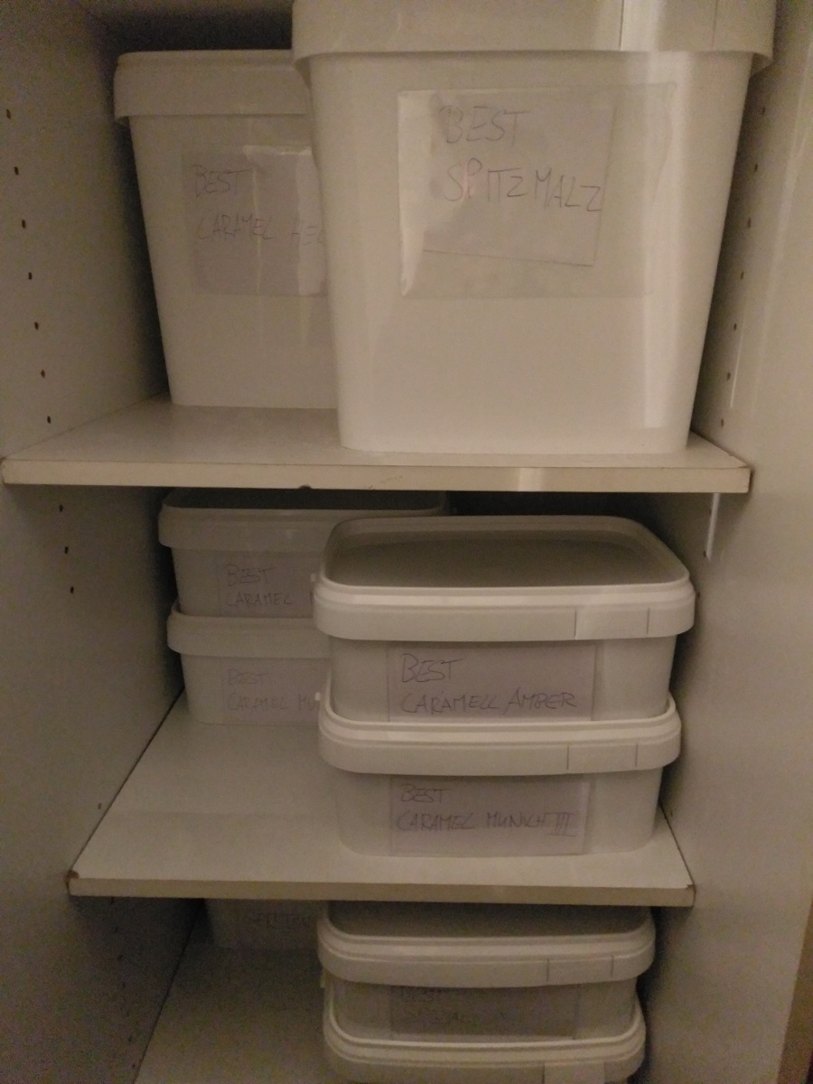 Ich habe mir jetzt auch mal endlich Kunststoffboxen angeschafft, um nicht mehr jedes mal nach der Malzentnahme die Säcke mit Kabelbinder verschliessen zu müssen. Und es ist aufgeräumter....