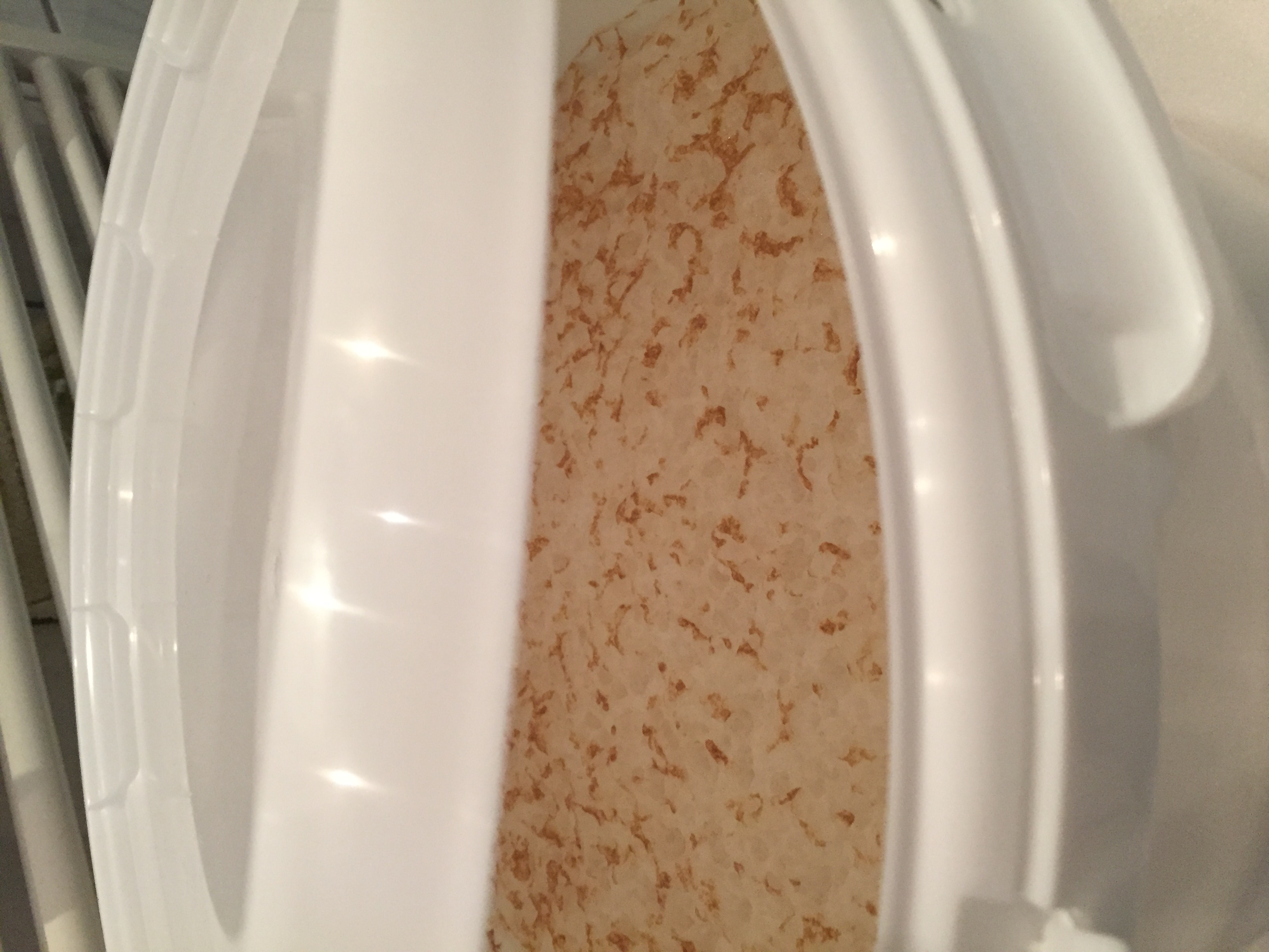 Im anderen Eimer gärt ein SMaSH mit der Danstar BRY 97. Nach gut 54h, wo ich nix im Gärröhrchen gesehen habe, habe ich dann vor lauter Ungeduld doch mal den Deckel angehoben und ne schöne Kräusendecke gesehen. Anscheinend tut sich doch noch was. Weiß der Geier wo die Gase entweichen. Hatte mir schon echt Gedanken gemacht und schon Wasser abgekocht, um ne US 5 zu rehydrieren.