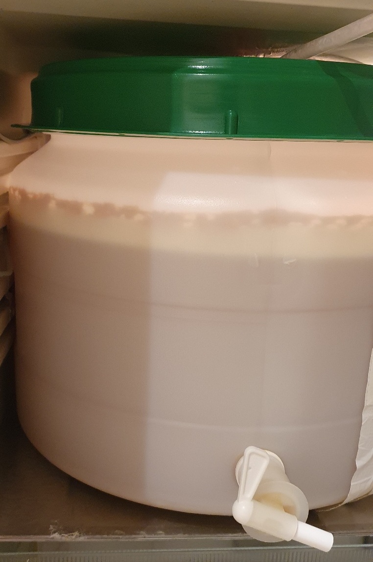 Blöderweise scheint der Deckel des Gärfasses undicht zu sein. Der Gärspund hat nicht einmal geblubbert und ich hatte schon Sorge, dass die Hefe nicht anspringt. Aber rund ums Fass riecht es nach Hefe, oben ist weisser Pelz drauf und langsam setzt sich auch unten was ab. Es scheint was zu gehen.