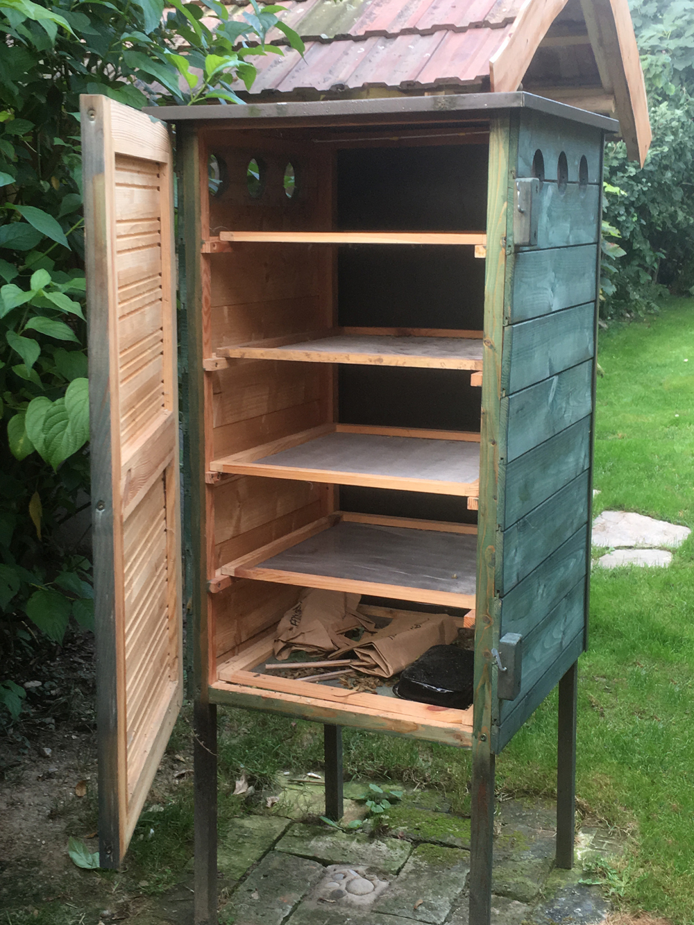 So ein Trockenschrank ist schnell gebaut – ein Kasten mit Rahmen die mit Fliegengittern bespannt sind, dazu Dach und eine Wand aus dunklem Blech. Die Septembersonne schafft da locker 50–60°. Ists nicht so warm kann man ihn auch noch pimpen. Schwarz ausgemalter Kasten mit Glasdeckel daneben und von dort Lüftungsschlauch in den Schrank gelegt verstärkt den Effekt enorm. Aber auch so waren 2 kg Hopfen nach 2 Tagen perfekt.