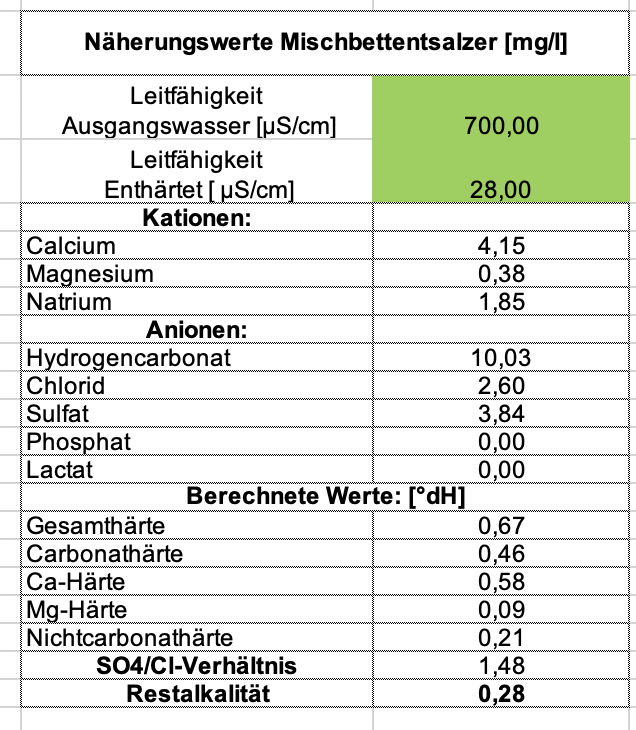 Wenn du mit dem klar kommst und eh schon hast dann Tippe die Werte aus der Mischung ein die du hast die der Rechner hier gibt und rechen dann mit BnW. Oder du nimmst eine Näherung und rechnest die Werte schnell mit der Hand. Wenn das VE-Wasser mit 0 ppm angenommen ist und du 20% Rohwasser mit 80% VE-Wasser mischt, dann einfach deine Werte mit 0,2 Multiplizieren und du hast eine gute Näherung der Werte der Mischung.Fujigen hat geschrieben: Montag 24. Oktober 2022, 20:48 Den Rechner von Bru´n Water besitze ich in der lizensierten Version auch.