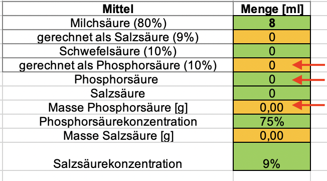 Im Feld Masse Phosphorsäure (unterer Pfeil) kannst Du dann die benötigte, abzuwiegende Menge ablesen.