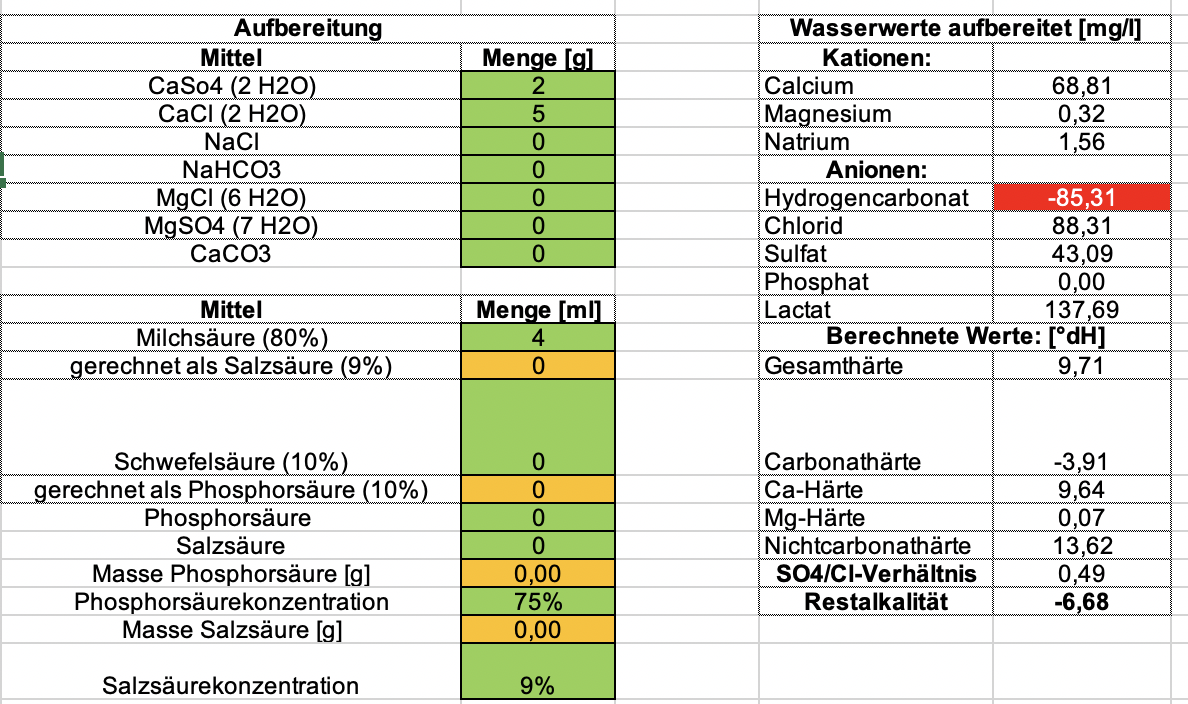 Das Brauwasser bereite ich theoretisch mit dem hier verwendeten Wasserechner (Schlupfs u.a.) am Rechner vor.