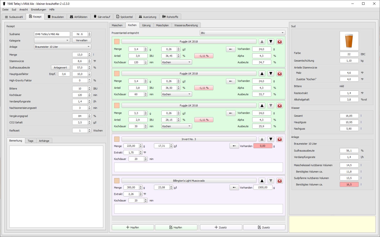 Habe ein Rezept für den "Timothy Taylor Landlord" erst im Brewfather nachgestellt, um ein Gefühl für die englischen Brewhouse Efficiency Angaen zu bekommen. Das resultierende Rezept hab ich dann in den KBH üertraben wollen. Ist natürlich nicht alles 100% stimmig, die IBU Berechnung ist scheinbar etwas anders, die des Alkoholgehalts ebenfalls...aber das sind alles Variablen bei denen ich erstmal auf den KBH vertraue :)
