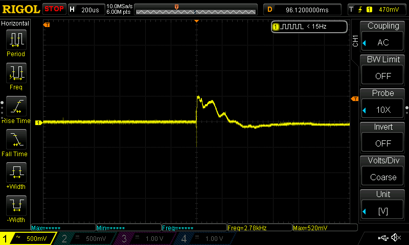 Gemessen hab ich mit einem Wandler 50A -> 1V. Der Peak ist bei 500 mV. Der Strom nach dem Peak ist der Leerlaufstrom der IDS2