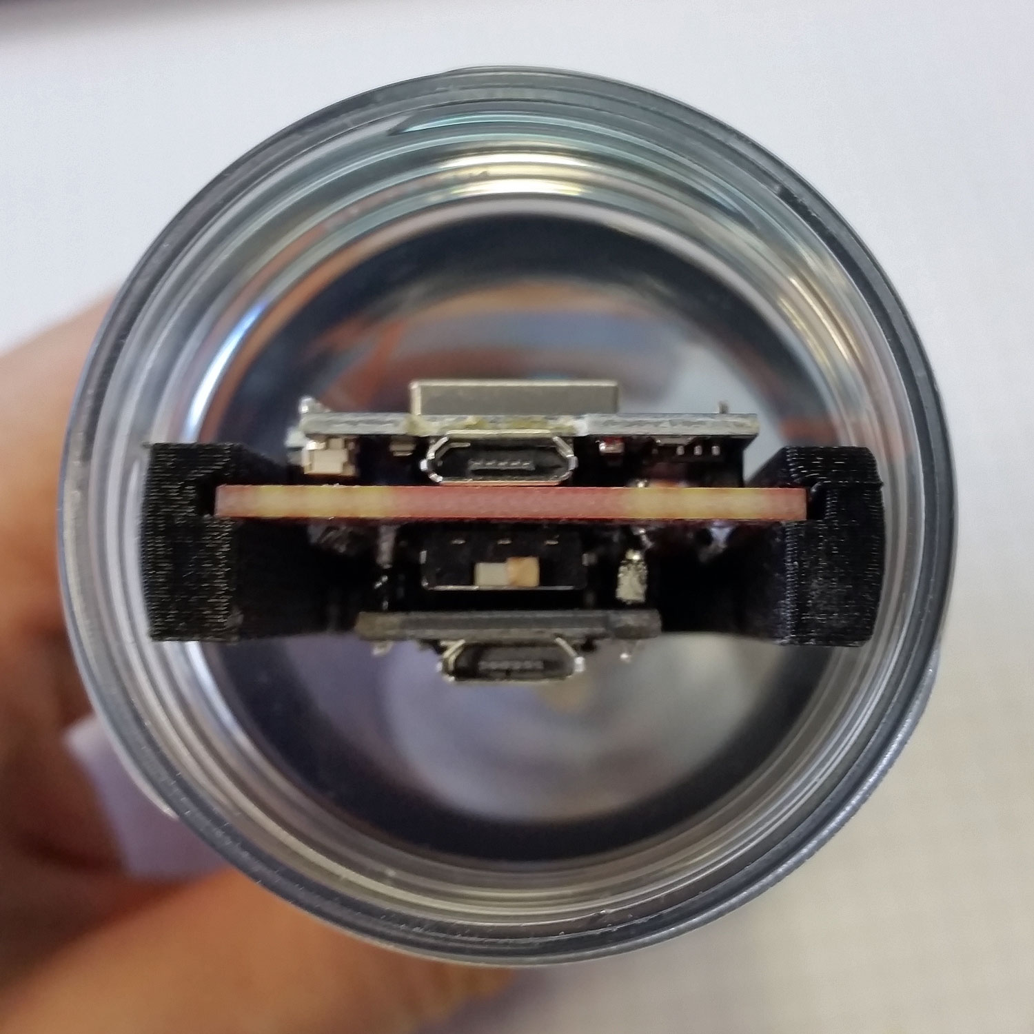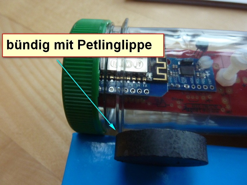 Der Grund ist, dass durch die exzentrische Lage der Platine der Wemos ganz knapp an die Petlingwandung kommt und vor allem die innere Lippe der Verschraubung evt. ganz knapp die Wemosplatine berühren kann.