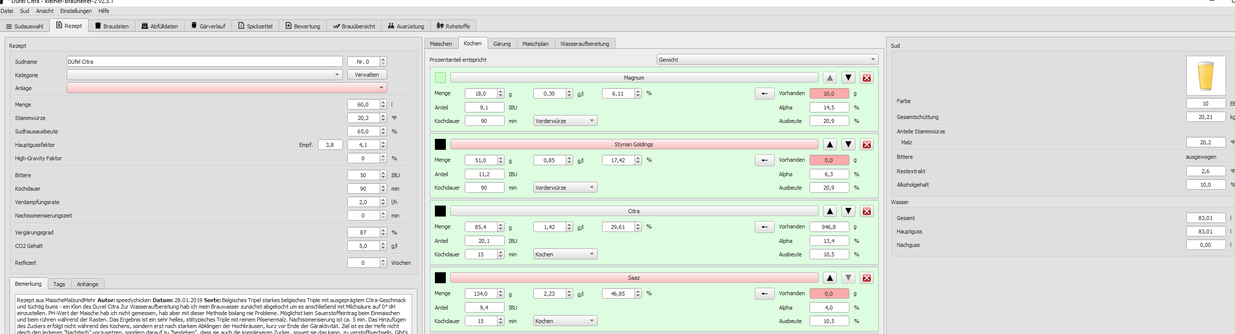 Die automatische Hopfenberechnung ist etwas tricky. Ich stell bei importierten Rezepten immer auf Berechnung nach IBU um. Dann schau ich ob zuviel oder zu wenig Hopfen eingestellt ist. Dann wieder umschalten auf ignorieren und den Rezept-IBU-Wert hoch oder runter setzen bis es so nah wie möglich passt und dann auf automatisch umstellen und auf den ursprünglichen Rezept-IBU-Wert einstellen. So werden die Hopfengaben alle zusammen hoch skaliert.