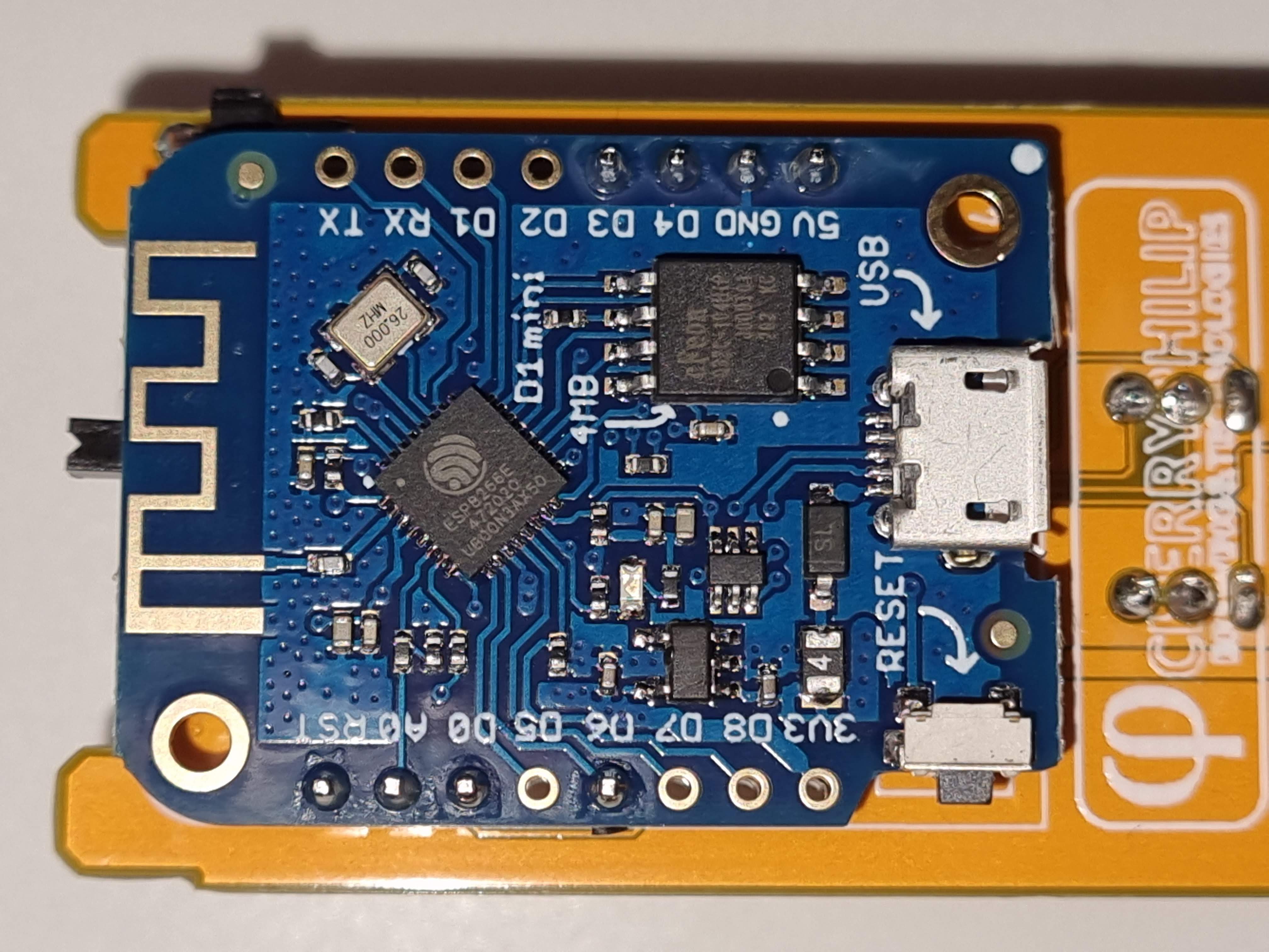 Anmerkung: Der untere Micro-USB-Anschluss zum Flashen ist somit nicht mehr erreichbar, aber flashen geht ja auch per WLAN. An den Resetknopf kommt man mit einem feinen gebogenen Federzieher/Hakenwerkzeug gerade noch so dran. Ist halt fummelig.