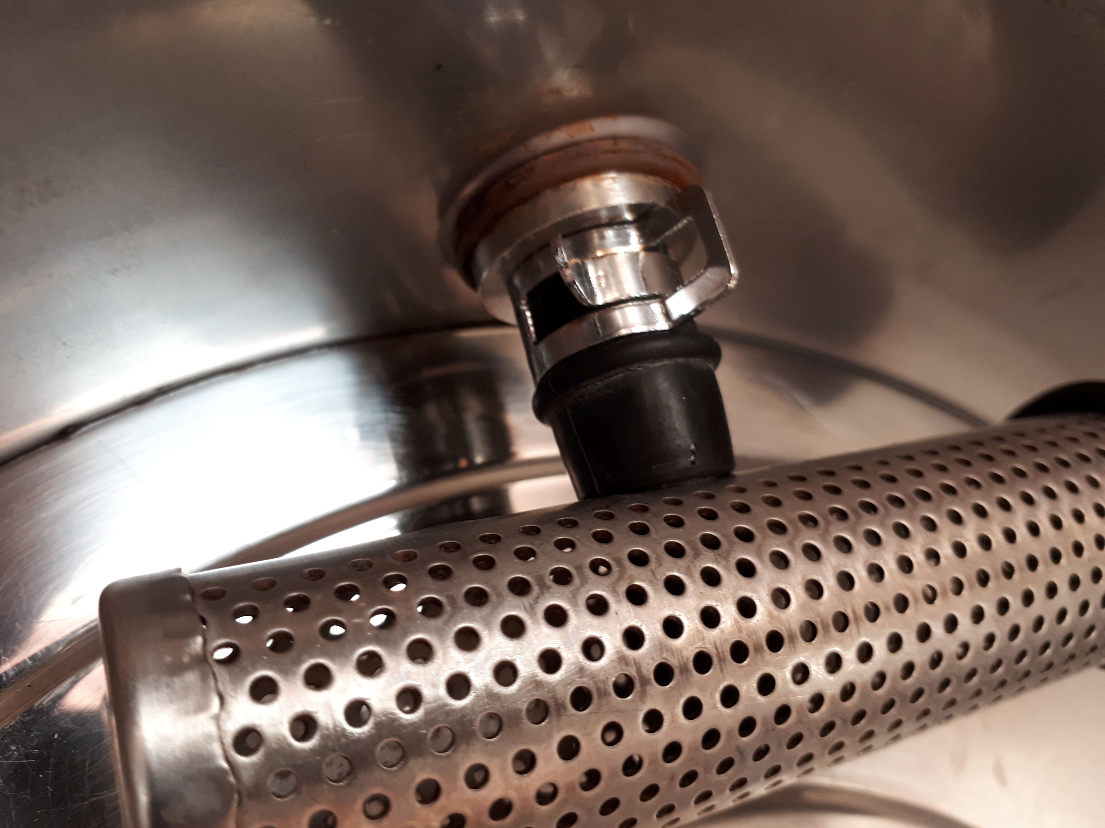 Das Überlaufrohr besteht aus zwei Hälften, die in der Mitte mit einer Art Klammer zusammengesteckt werden, obendrauf kommt dann entweder der Überlauf (beim Maischen) oder der Grainstopper (beim Einmaischen).
