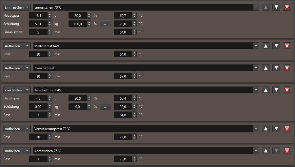 Im kbh2 Rezept wird 100% Schüttung in 80% Hauptguss eingemaischt. Nach der Zwischenrast werden durch (kaltes) Zubrühen die restlichen 20% Hauptguss zugefügt. Mit der einfachen Formel Masse * 75 ist die Anforderung 1°C pro Minute schnell erledigt: