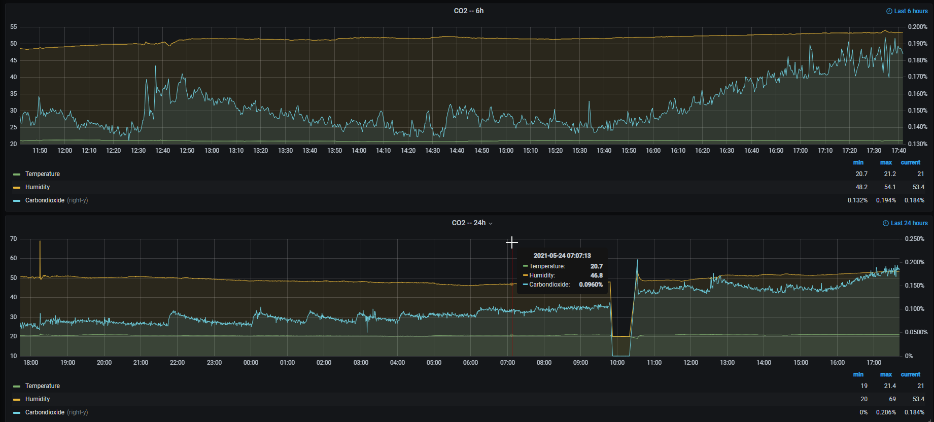 So ab 22 Uhr sieht man wie immer wieder CO2 auf den Sensor "fällt". das war 4h nach dem Anstellen.