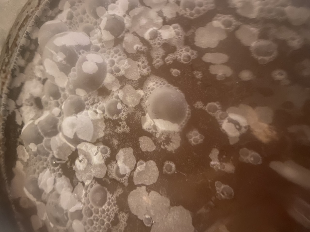 Eine Frage an die Sauerbier-Experten: Beim Apricot Sour werden immer wieder kleine Fruchstücke nach oben getrieben (siehe "bauschaumartige" Kräusen auf dem Foto); war anscheinend nicht fein genug püriert. Würde eigentlich gerne Eingriffe wie Unterühren vermeiden, bin nun aber nicht sicher, ob da nicht ansonsten ein Schimmelrisiko besteht. Hat wer Rat?
