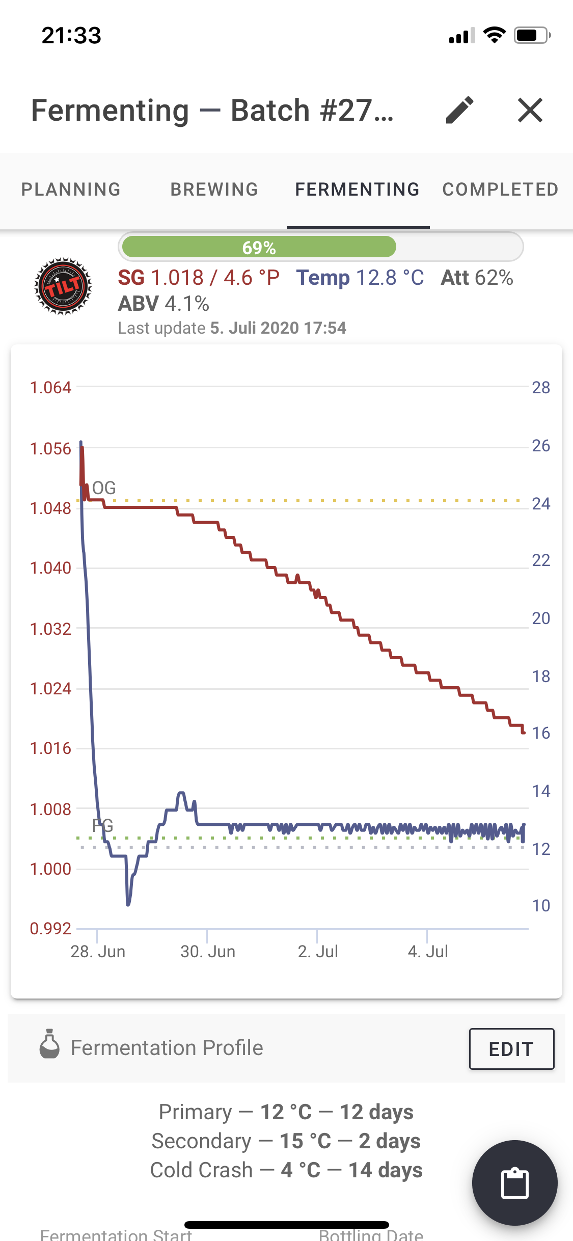 Jetzt hängt die Kühlung dran und es heist warten. Ich vergäre bei 12 Grad, der Chiller steht auf 6 Grad. Nur um schnell auf Anstelltemperatur zu kommen habe ich den Chiller auf -3 Grad eingestellt.