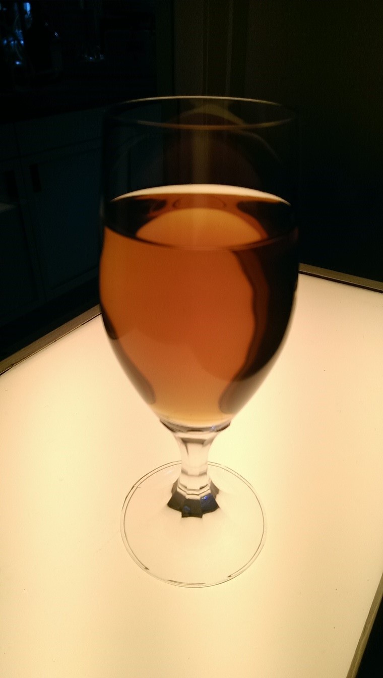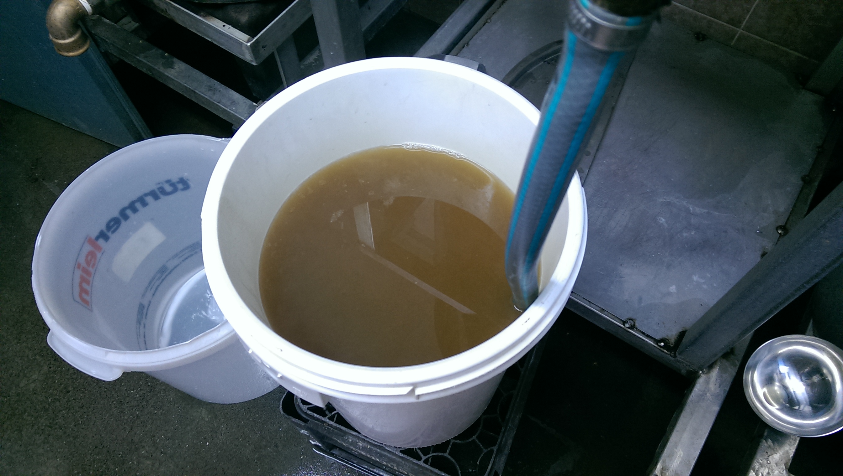 Das ist die Vorderwürze, also noch nicht gekocht.Im Fass dürfte sie dann sicher in Verbindung mit dem restlichen Rotwein, welcher sich noch in den Fassporen versteckt hat, noch etwas nachdunkeln. Vielleicht bekommt sie ja noch einen Hauch von rot.... :Grübel