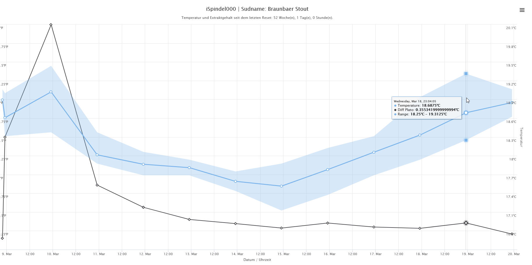 Es wird die Durchschnittstemperartur und die min/max Werte der Temperatur angezeigt ( blau ) und der Extraktabbau ( schwarz ).