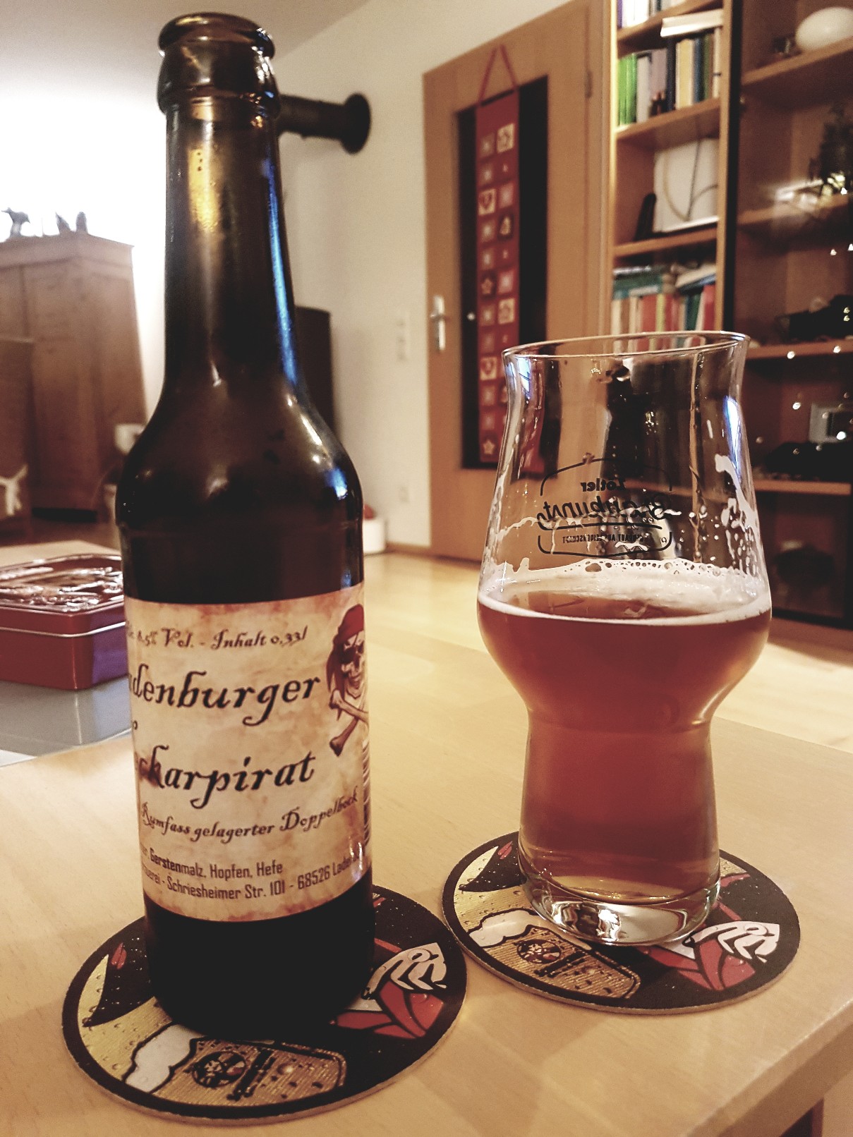 Ein Bier einer kleinen lokalem Bauerei. Ladenburger Neckarpirat, ein Doppelbock aus dem Rumfass. Nicht für jeden Tag geeignet, aber so als Urlaubsende Bier.