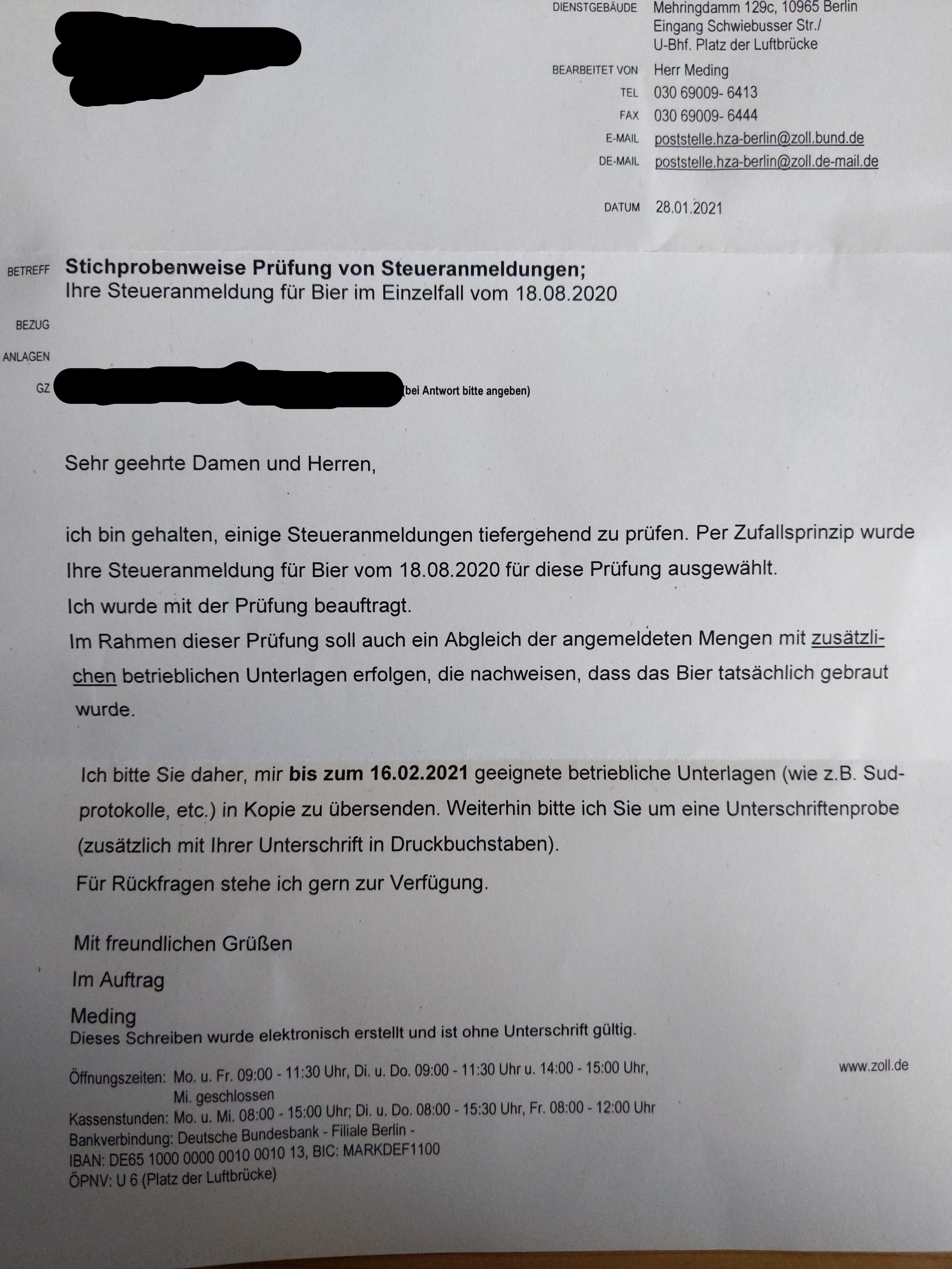 Ich als Hobbybrauer führe keinen Betrieb, sondern einen Haushalt. Deshalb würde ich erstmal keine Unterlagen herausgeben.