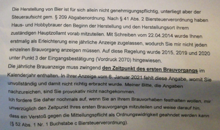 Das ist mir schon klar. Die Absurdität besteht ja darin, dass sogar ein "ab sofort" der Anzeige des Beginns der Tätigkeit genügt. Ich habe ja keine Verpflichtung, am angegebenen Tag auch wirklich zu brauen. Aus der Verordnung lässt sich ja sogar die jährlich zu wiederholende Anzeige nicht herauslesen. Das ist aber geschenkt. Auch die Androhung eines Ordnungswidrigkeitenverfahrens ist lächerlich, da ich ja meiner Pflicht der Anzeige nachgekommen bin. Wenn 200 Einzelanmeldungen nicht so viel Zeit (von mir) verschleudern würden.... ;-)bwanapombe hat geschrieben: Samstag 30. Januar 2021, 20:07Auf die Angabe des Herstellungsbeginn hat das HZA tatsächlich einen Anspruch. Allerdings hast Du ja schon mehrere Anzeigen geschrieben. Und der Herstellungsbeginn liegt irgendwann in der Vergangenheit (2015?).hiasl hat geschrieben: Samstag 30. Januar 2021, 18:26 Wollte hier ja eigentlich nichts mehr schreiben, ich kann euch aber diese Stilblüte des HZA Schweinfurt nicht vorenthalten.![]()