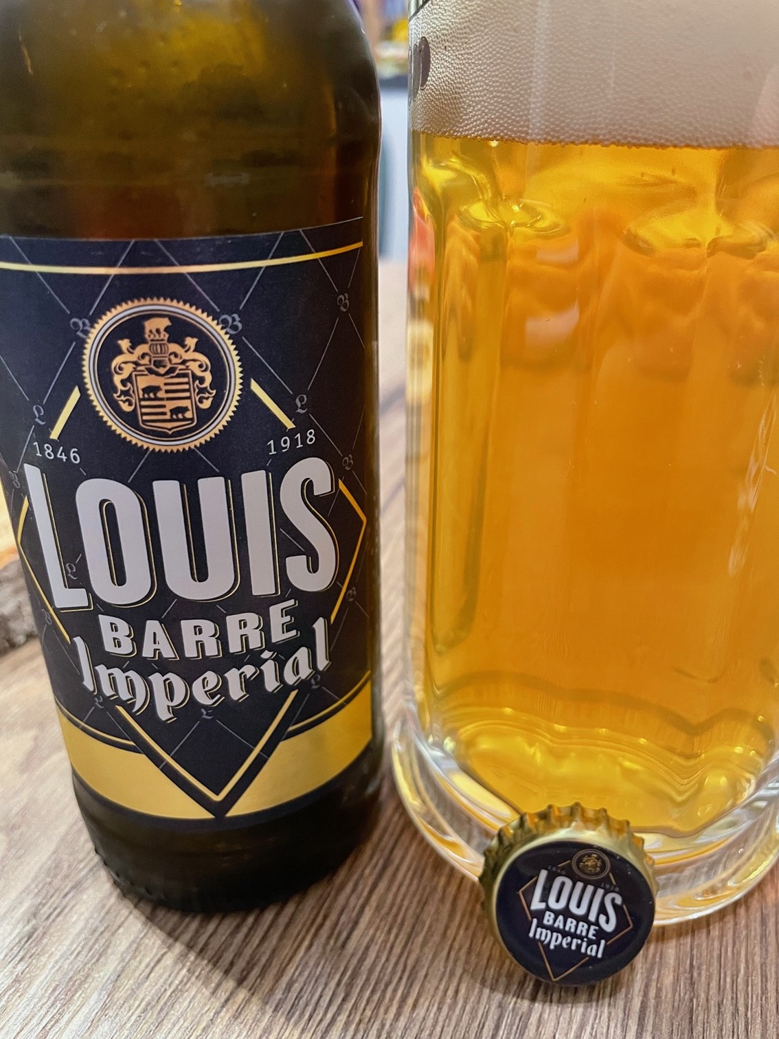 Ein Louis Barre Imperial Bouquet Lager. Rückseitiges Etikett finde ich super, da viele Infos zu den Malzen (PiMa, MüMa, Carapils, Carahell) und Hopfen (Perle, Saphir). Malzig, Abgang ziemlich bitter. Glanzfein klar.