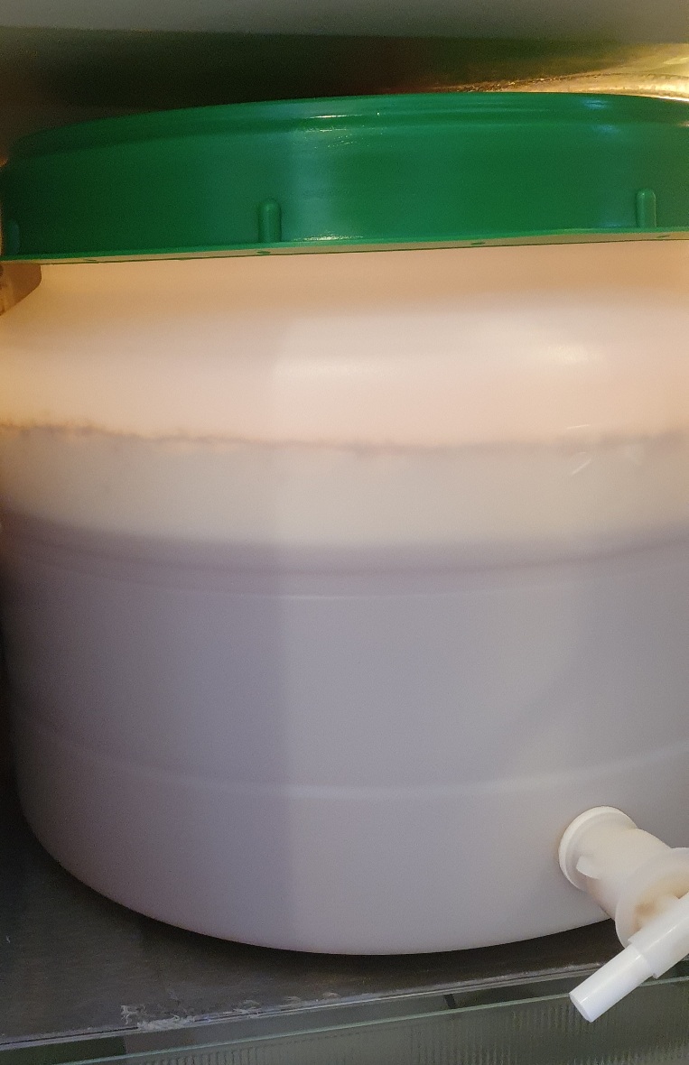 Ungekocht über Nacht in drei Gäreimern im Garten abgekühlt und am nächsten Tag in einen Gäreimer abgefüllt. Bei uns im kühlen Flur über eine Wochen ankommen lassen (s. Bild.). Da sich an den Rändern des Gärbottichs ein paar Schimmelflecken gebildet haben, wurde es jetzt von mir ins Keg umgefüllt, der Kopfraum geflutet und gärt jetzt munter weiter vor sich hin. Bisher noch deutliche DMS-Noten wahrnehmbar. Werde das Ganze mal beobachten und dann im Sommer ggf. noch Früchte hinzufügen. Mal schauen, was der Garten so hergibt.