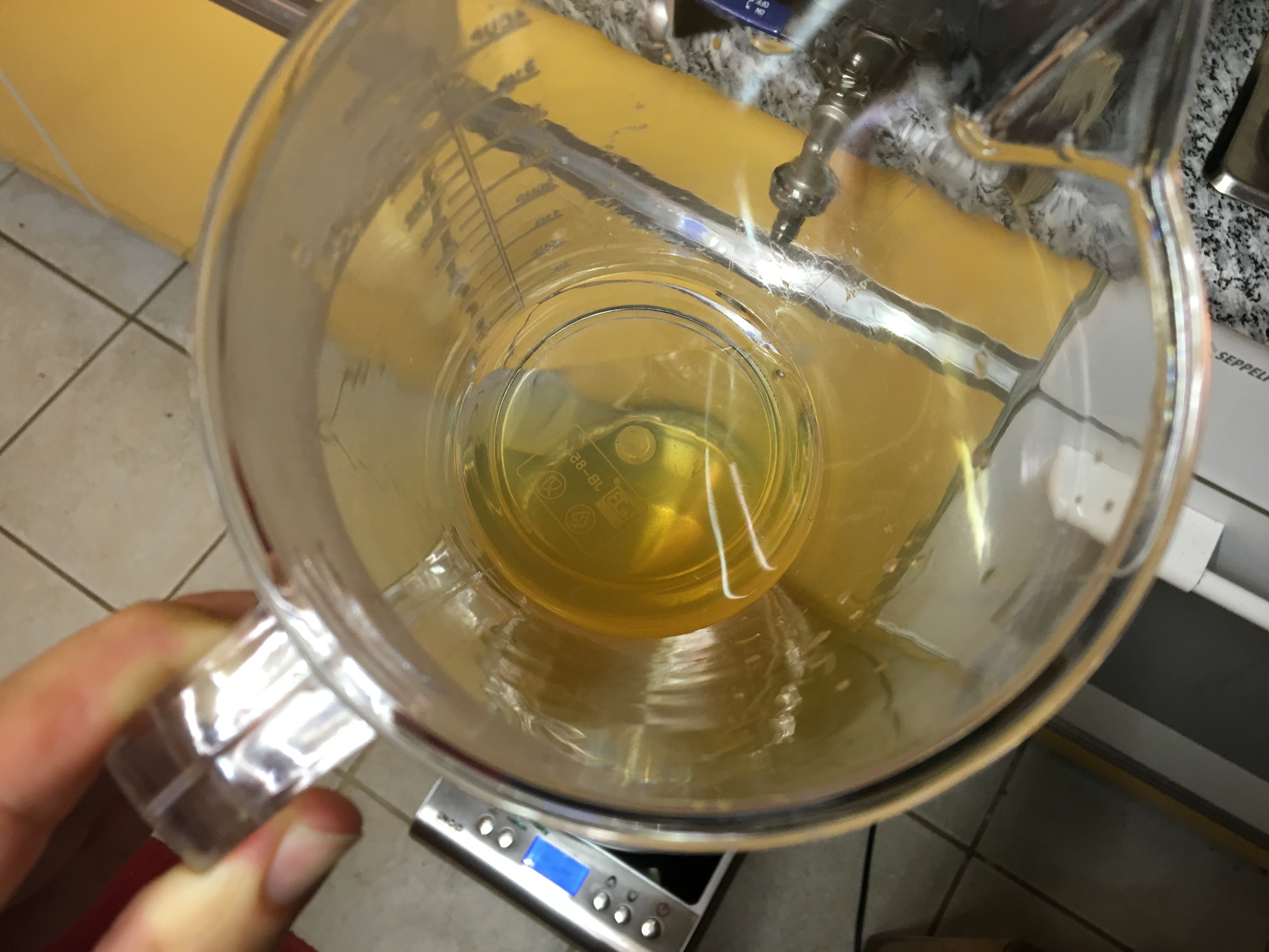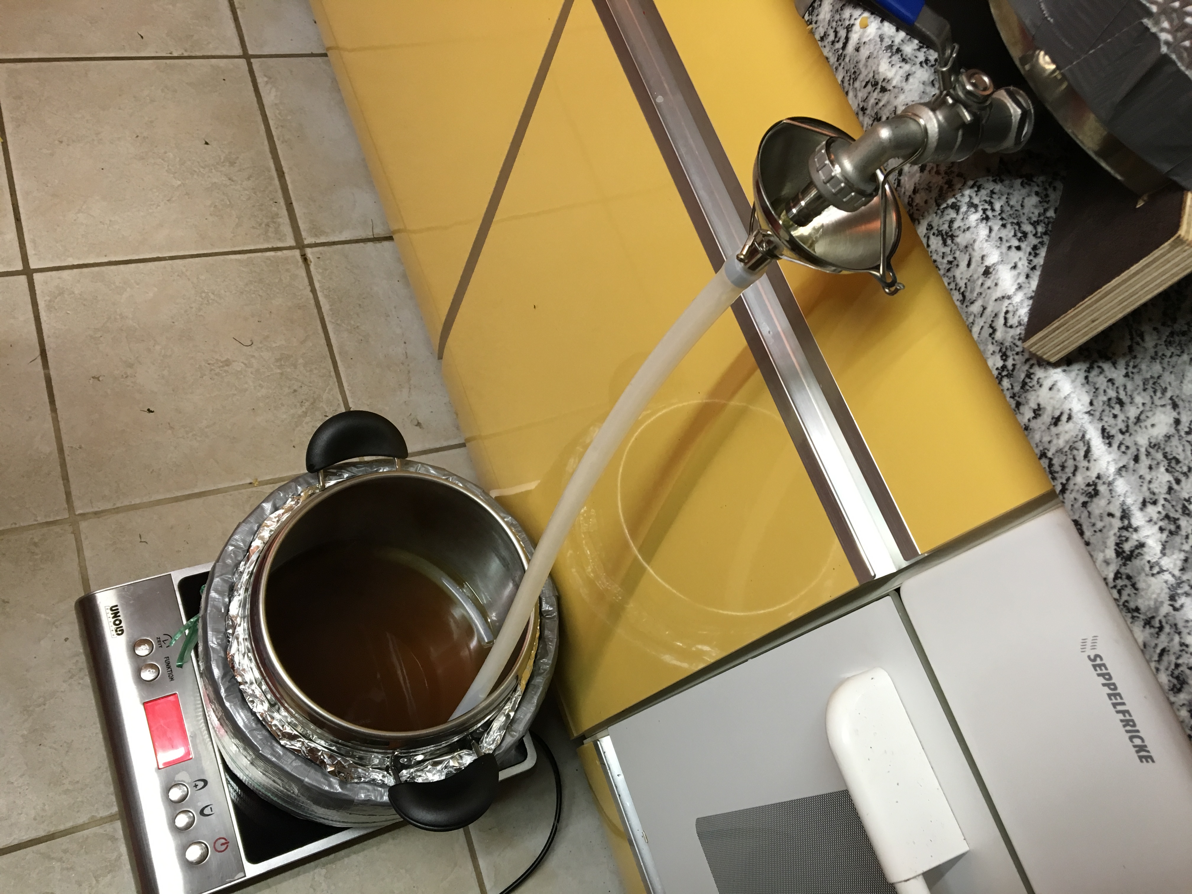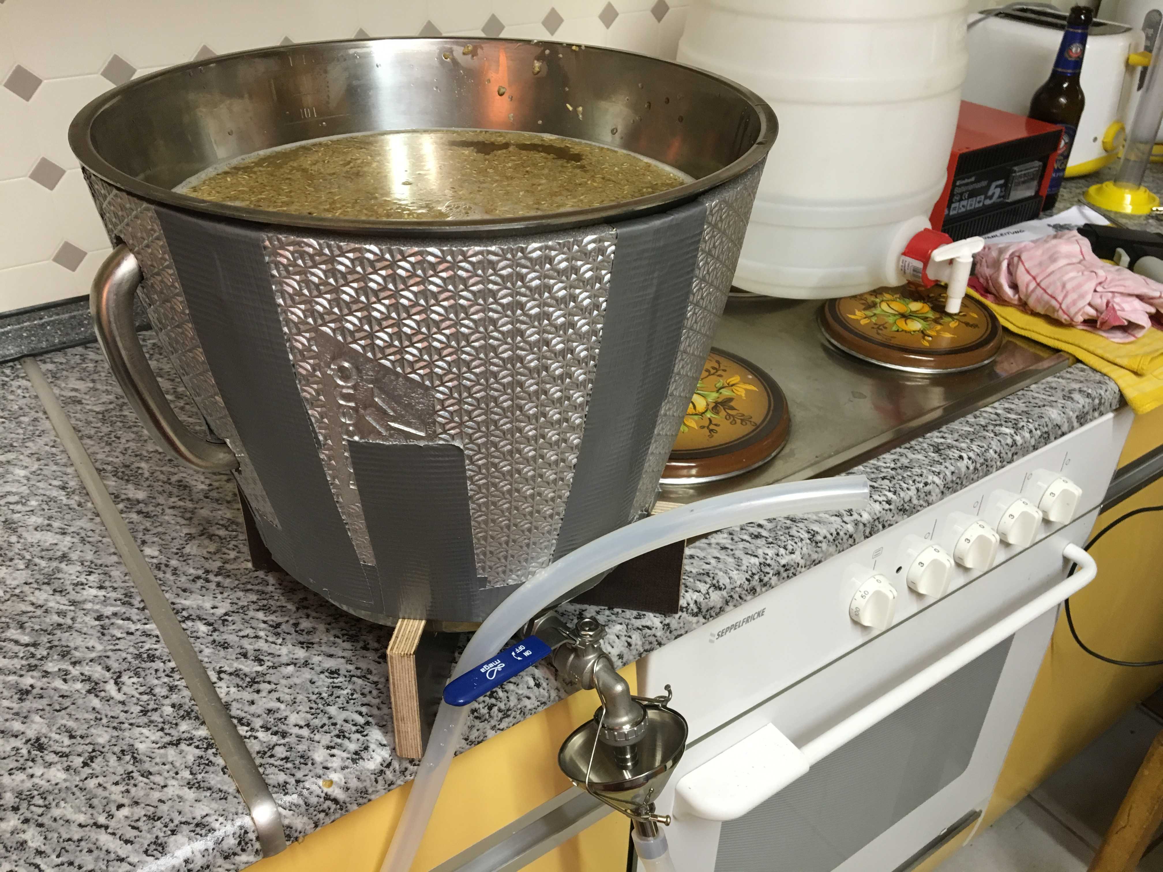 Das mache ich übrigens standardmäßig, auch mit mehr als 2 Liter. Ist einfach auch effizient, wenn man schonmal vorheizen kann.Die letzten zwei Liter habe ich in einem separaten Topf aufgefangen und schon mal angefangen die Würze zu kochen. 10min nach Anfang des wallenden Kochens war dann auch alles durchgelaufen.