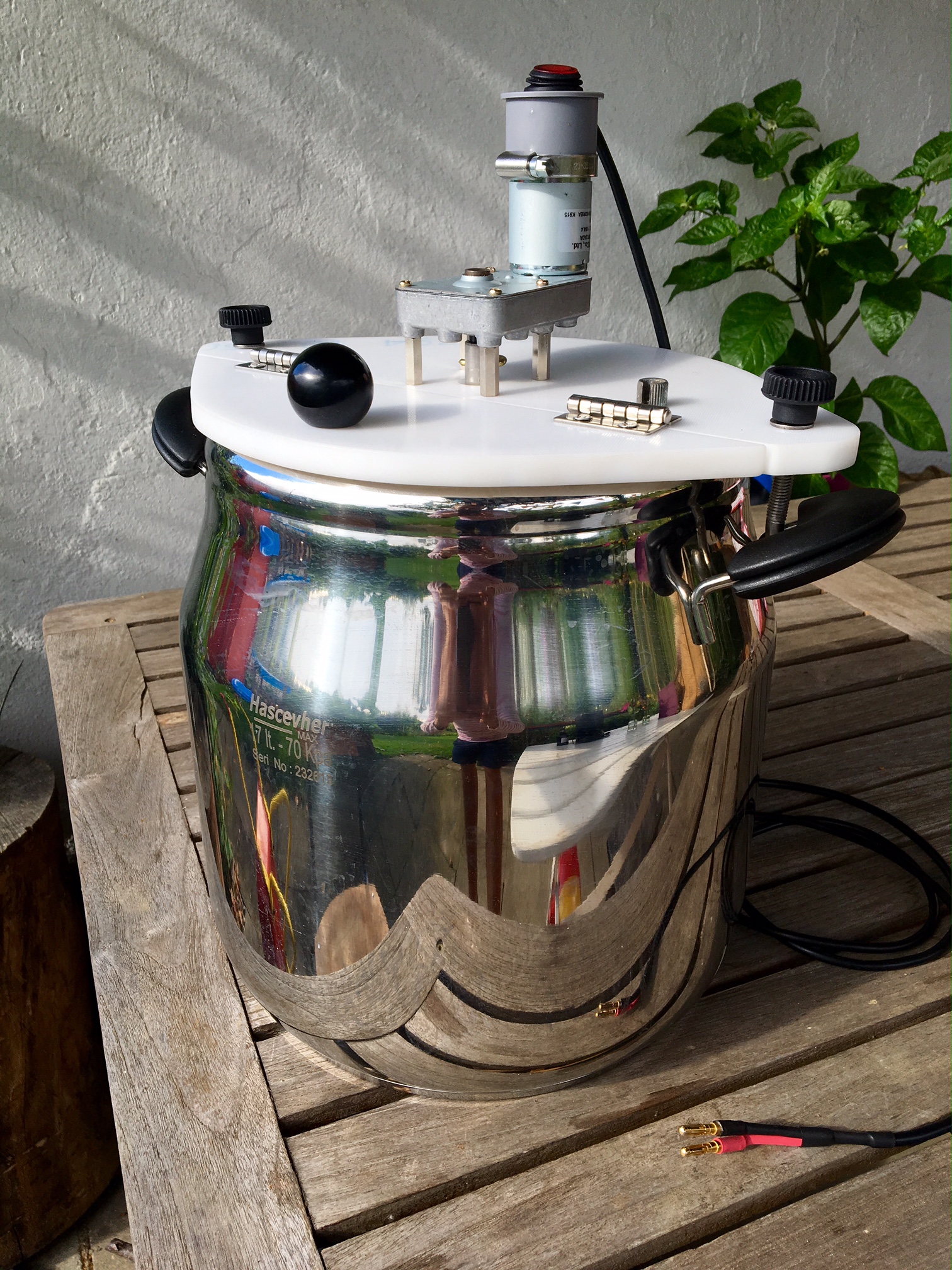 Eigentlich sollte der erste Sud mit weniger Technik auskommen. Allerdings konnte ich mit meinem Schwager, mit dem der 1. Sud zusammen gebraut werden sollte, keinen Termin finden, so dass sich der 1. Sud zeitlich immer mehr in Richtung Herbst verschob. In der Zwischenzeit konnte ich nicht tatenlos warten und habe ein Rührwerk gebastelt. Dies hat mich beim ersten Sud auf jeden Fall reichlich unterstützt. Grundsätzlich wollte ich trotz geringer Ausschlagmenge die Möglichkeit bewahren, die Anlage später mittels regelbarer Kochplatte zu automatisieren, daher habe ich keinen Einkochtopf genommen, sondern einen vorhandenen Schnellkochtopf mit ca. 15L max. Volumen (Oberkante Topf).