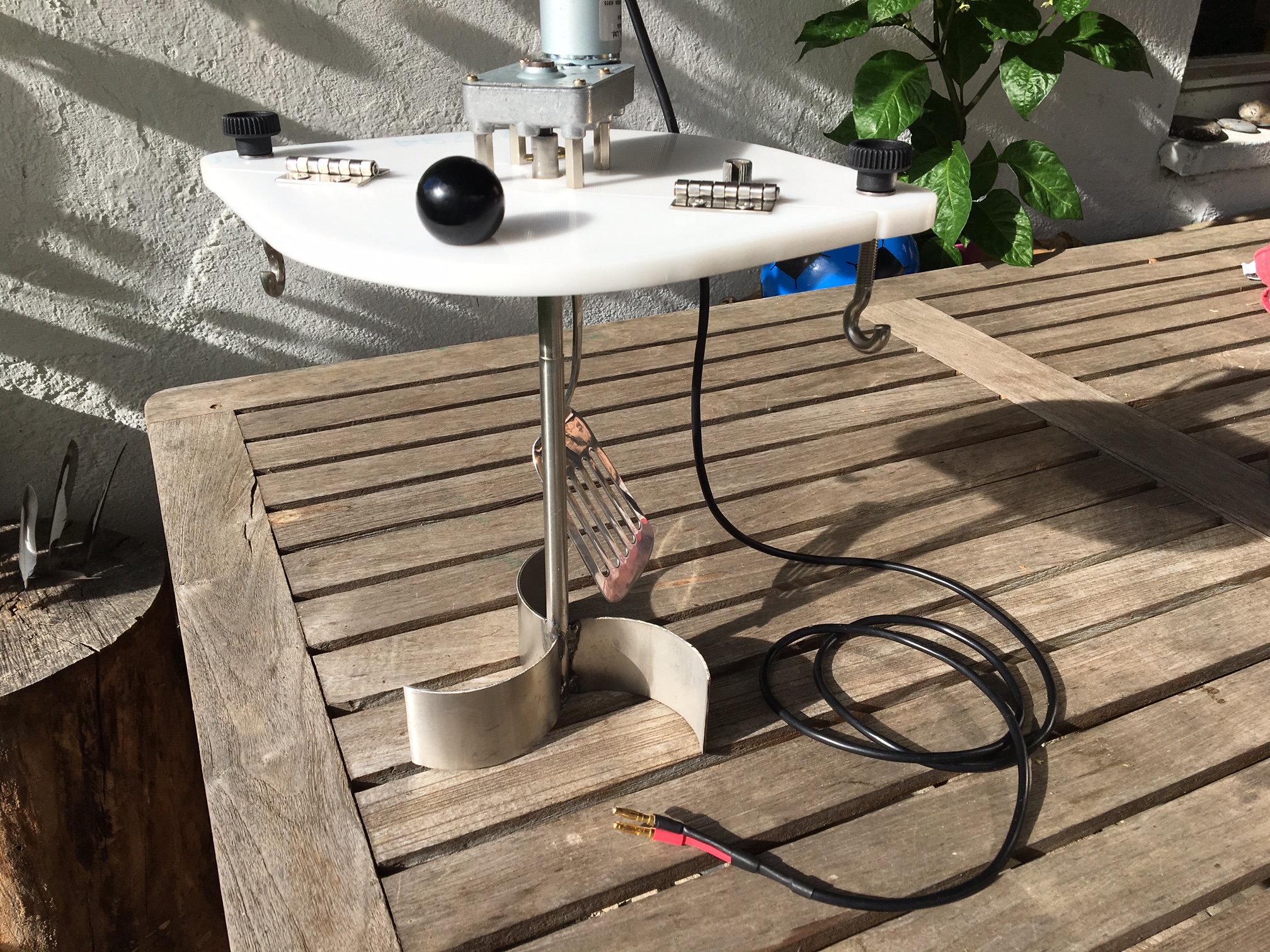 Schön gemacht, die beiden seitlichen Haken finde ich auch sehr gut, damit hält das Ding sicher bombenfest auf dem Topf. Das ist bei meinem gekauften Rührwerk nicht so gut gelöst. Ich habe zwei Schrauben, die seitlich an die Topfwand drücken. Es hält zwar auch, macht aber bei weitem nicht einen so soliden Eindruck, wie deine Haken.