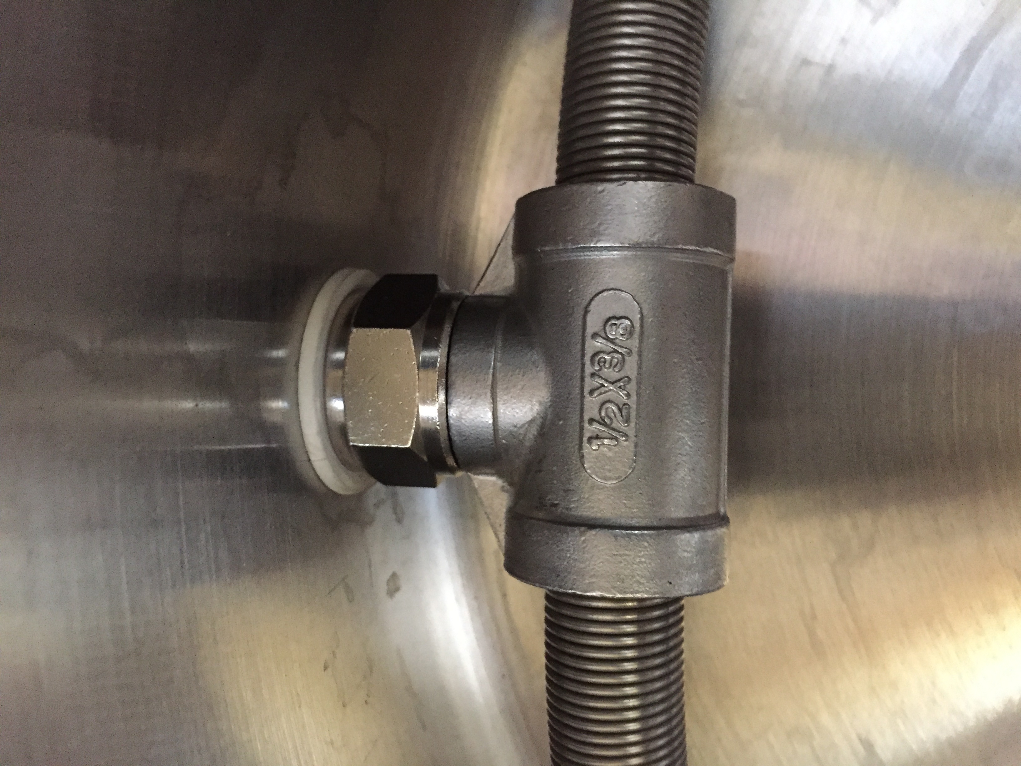 Du kannst die ganzen verwendeten Zusatzteile sparen, wenn du das Original T-Stück der Läuterhexe durch ein handelsübliches T-Stück mit 3x 1/2"IG ersetzt. Der 1/2" Ablaufhahn kann dann direkt in das T-Stück geschraubt werden, d.h. Hahn von außen, T-Stück von innen im Topf. Das T-Stück ragt dann nicht so weit zur Topfmitte wie deine Konstruktion.