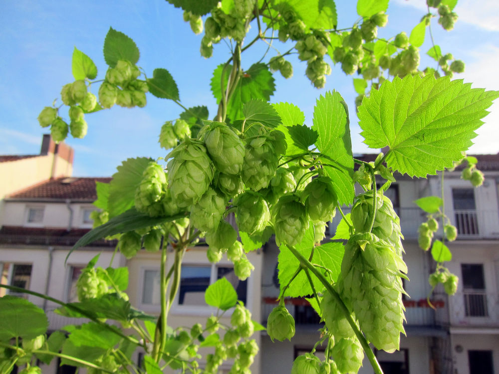 Wir haben in Bremen-Findorff im letzten Jahr Hopfen gepflanzt: Cascade und Smaragd (lecker)